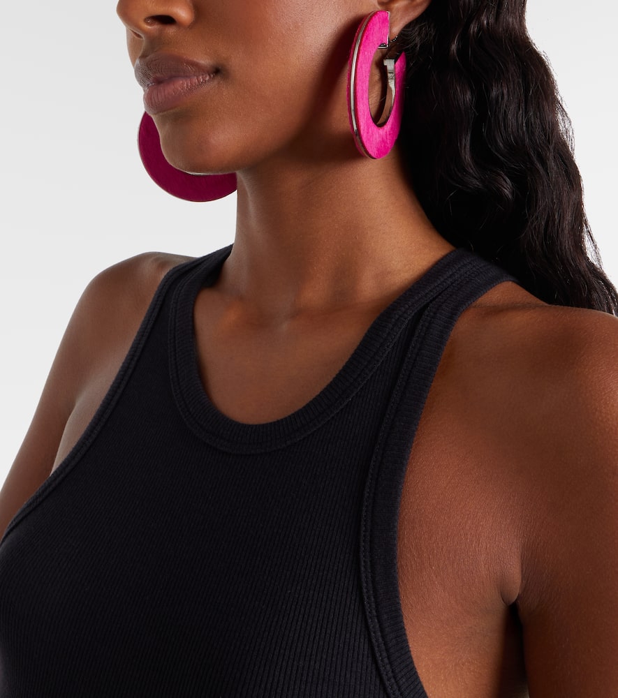These Leather-trimmed earrings by Alaïa are a bold and modern new arrival. Made in Italy from aluminum and calf leather, these earrings feature a unique blend of materials, with a stunning pink leather detail on the sculptural silver-toned hoops. Their unique design is a celebration of a playful and modern aesthetic and is perfect for adding a touch of avant-garde drama to any look. They are a true statement piece that will set you apart from the crowd.