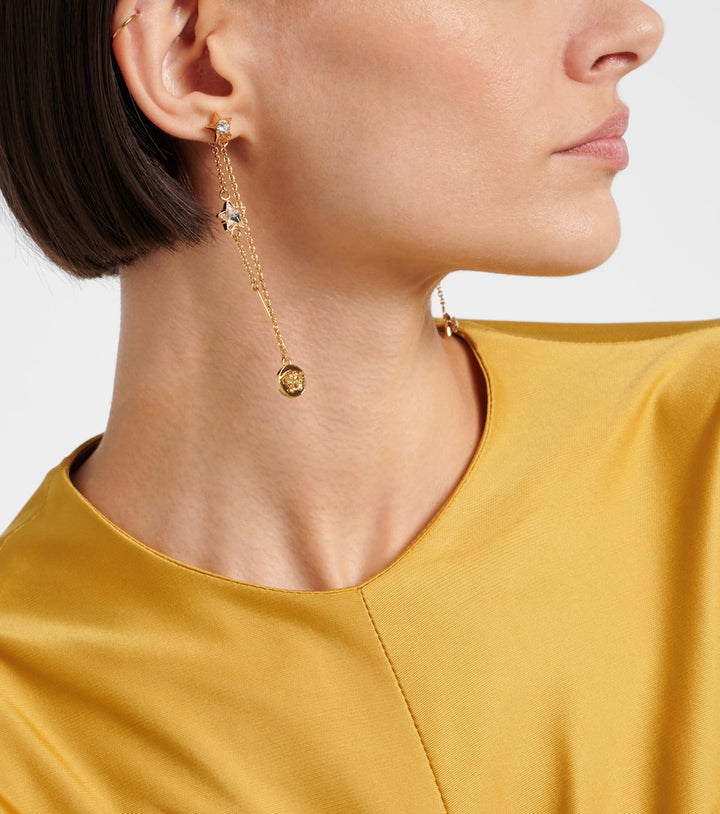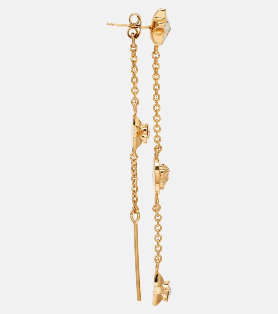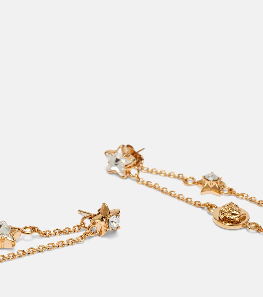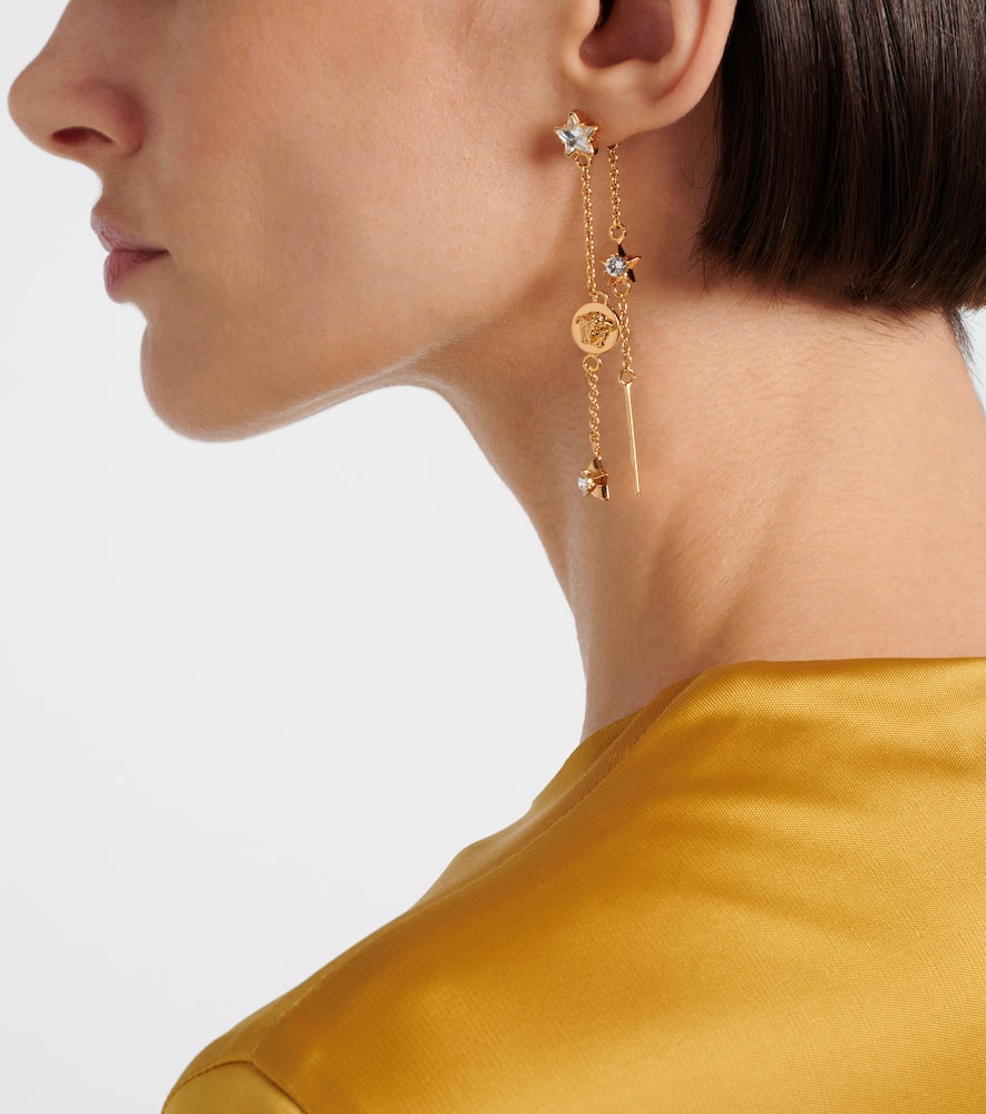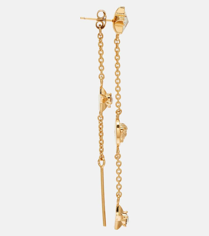 These Medusa crystal-embellished drop earrings by Versace are a classic and iconic new arrival. Made in Italy from metal, these drop earrings feature the brand's signature Medusa emblem, a powerful symbol of style and heritage. They are beautifully adorned with shimmering crystals, adding a touch of brilliant sparkle. These earrings are a versatile staple that can be worn for both special occasions and for adding a touch of everyday luxury.