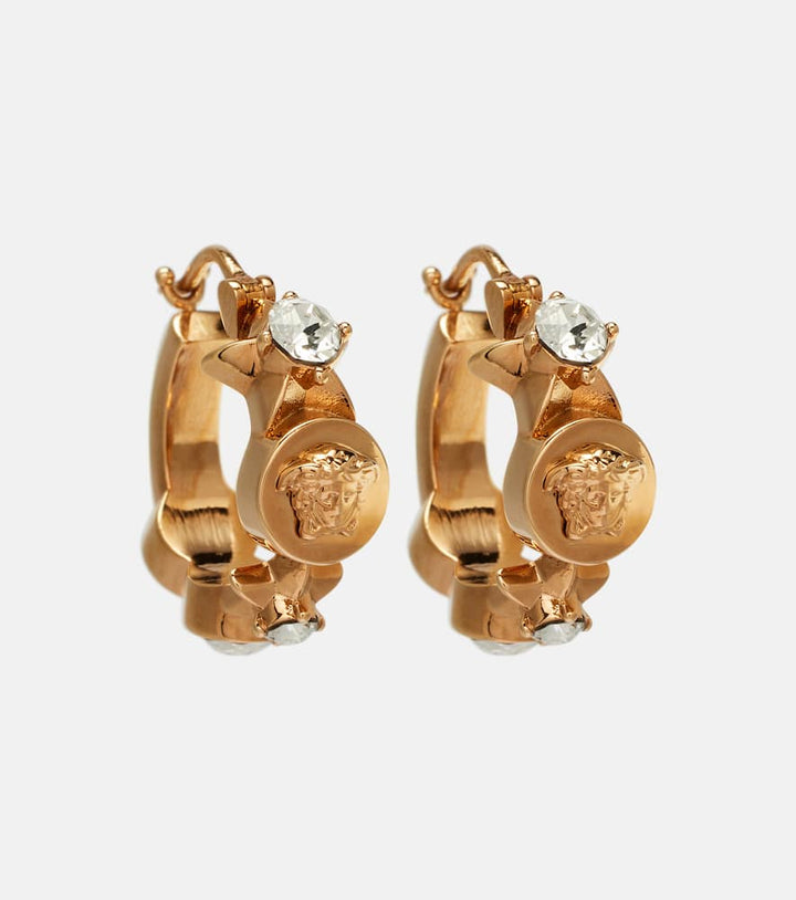These Medusa Star hoop earrings by Versace are a classic and iconic new arrival. Made in Italy from metal, these hoop earrings feature a star design with the brand's signature Medusa emblem, a powerful symbol of style and heritage. They are beautifully adorned with shimmering crystals, adding a touch of brilliant sparkle. These earrings are a versatile staple that can be worn for both special occasions and for adding a touch of everyday luxury.