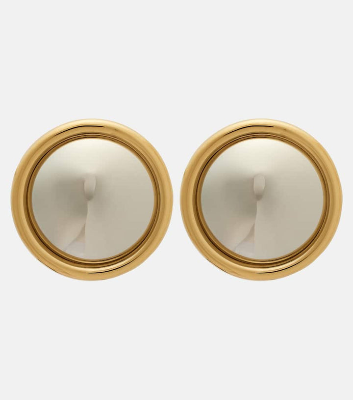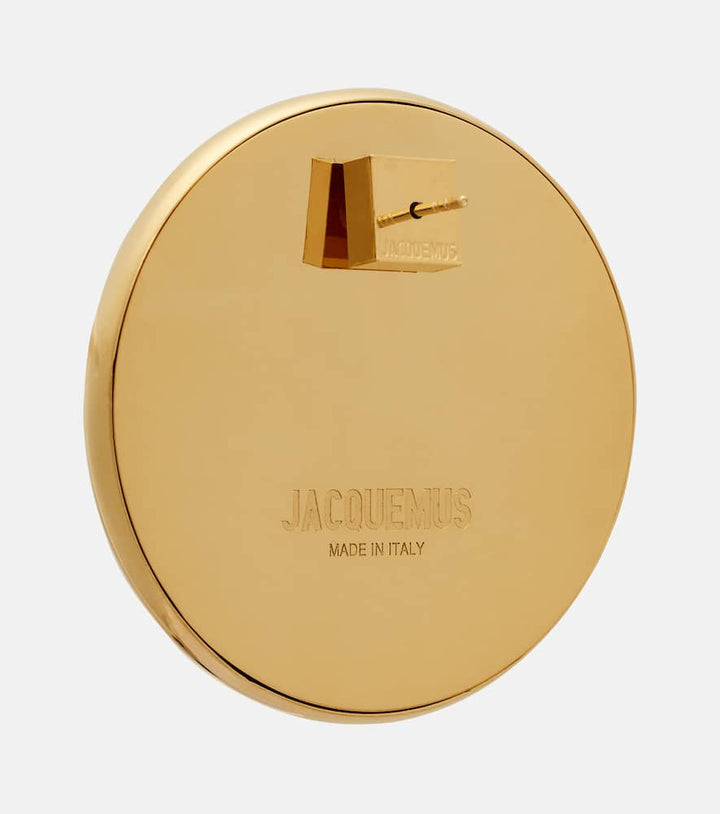 These Rond drop earrings by Jacquemus are a bold and sculptural new arrival. Made in Italy from brass, these earrings feature a unique, rounded design that adds an artistic flair to any look. The striking silver and gold color combination is a celebration of a playful and modern aesthetic and is perfect for adding a touch of sophisticated drama to your look. They are a versatile piece that will elevate any ensemble.