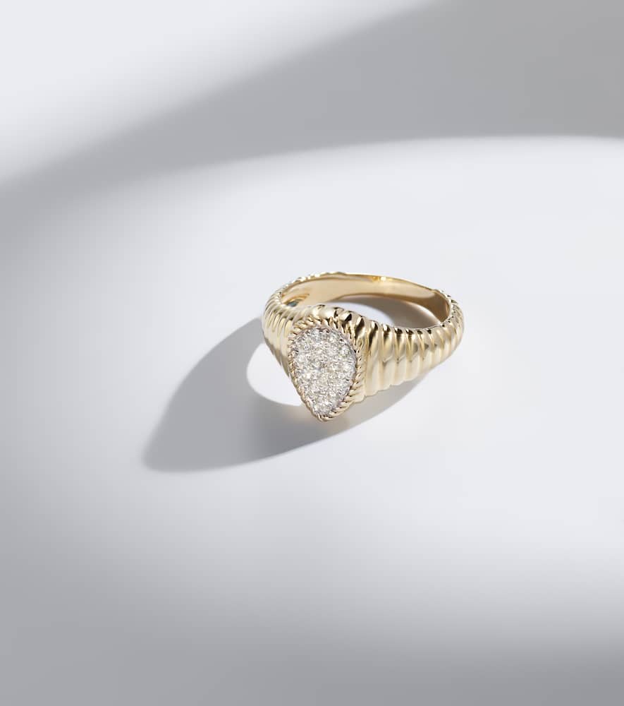 This 9kt gold ring with diamonds by Yvonne Léon is a magnificent and opulent statement piece. Made in France from 9kt yellow gold, this ring is a breathtaking masterpiece, combining the beautiful luster of gold with the brilliant sparkle of diamonds. The design is a celebration of a sophisticated and graceful style and is perfect for adding a touch of high-end sparkle to your look. It's a true investment-worthy piece.