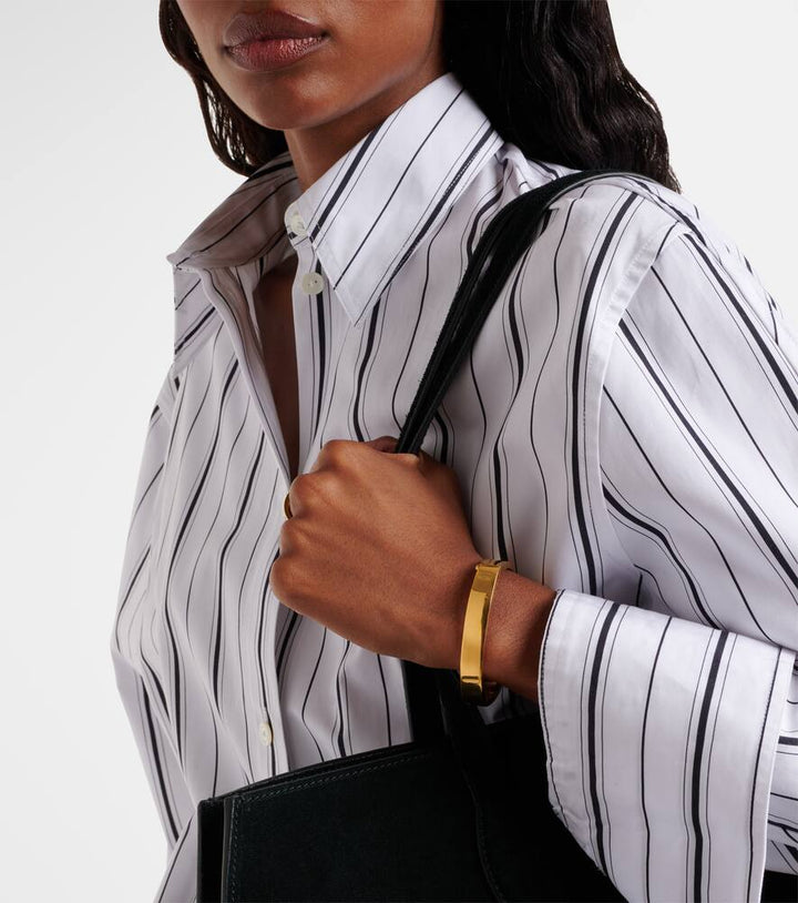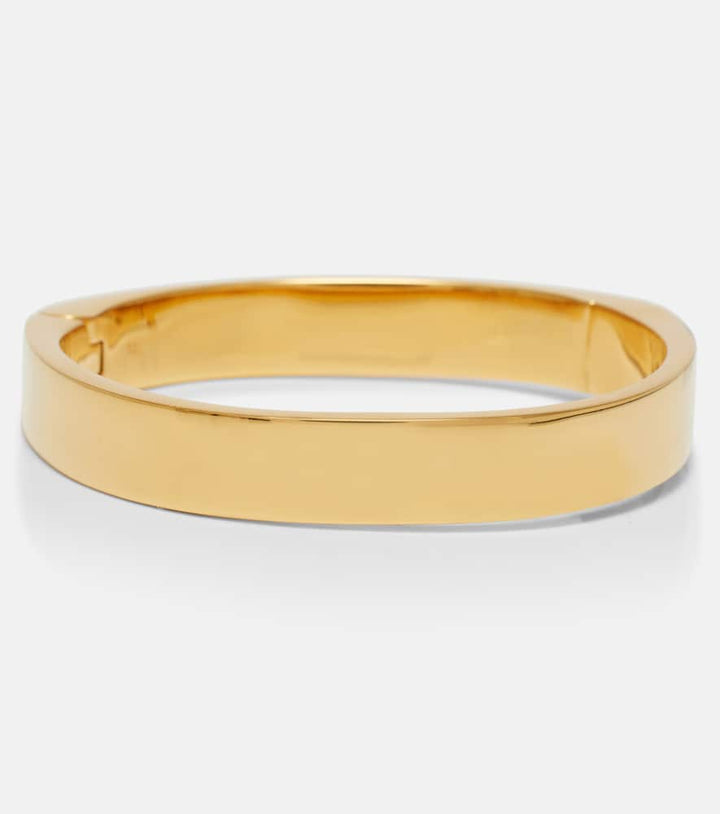 This Signature 18kt gold-plated bangle by Toteme is a sleek and minimalist statement. Made in Italy from 18kt gold-plated brass, this bangle features a clean and modern design that can be worn alone or stacked with other bracelets for a bolder look. This piece is a symbol of a refined and effortless approach to luxury and is perfect for adding a touch of sophisticated style to your daily look. The simple design ensures it will be a timeless staple in your jewelry collection.