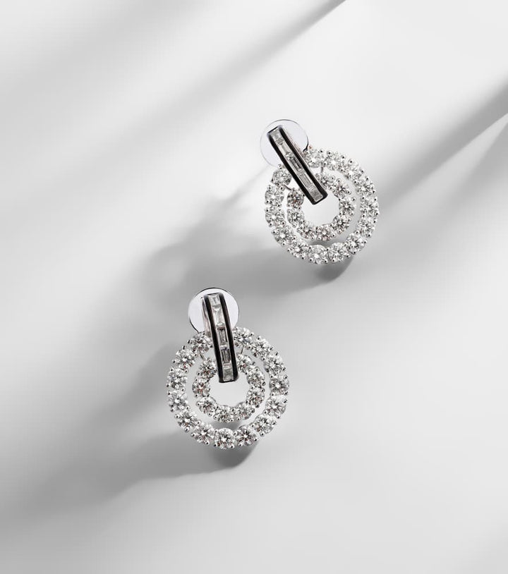 These earrings are made in India from 18kt white gold and enamel. They feature 6.72 carats of natural round and baguette-cut diamonds with G-H color grades and a VS clarity grade. They have a length of 27 mm (≈ 1.05 in) and a max width of 20 mm (≈ 0.8 in).