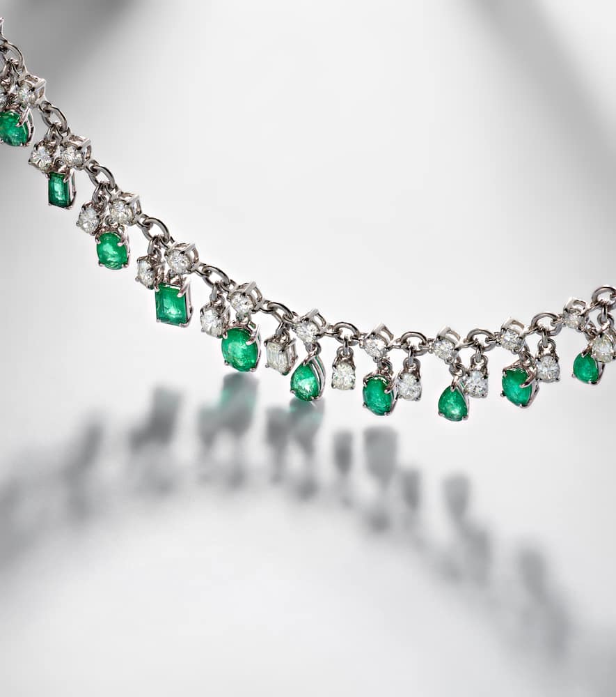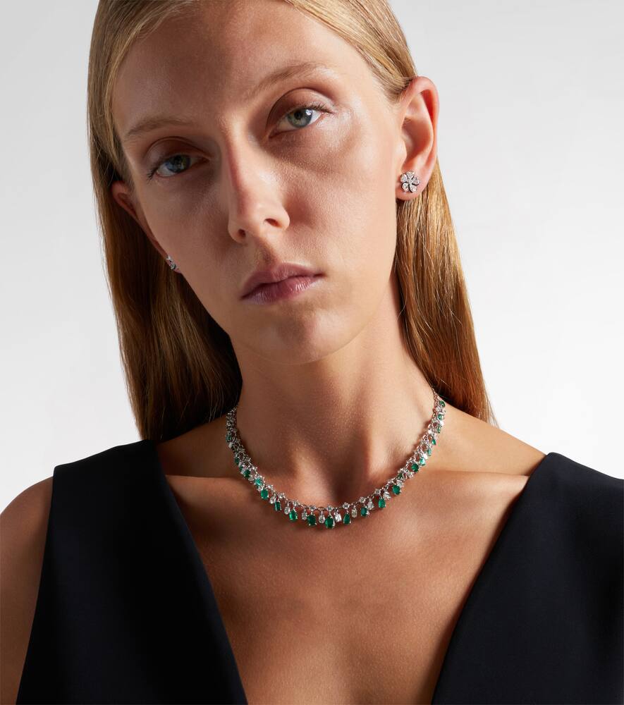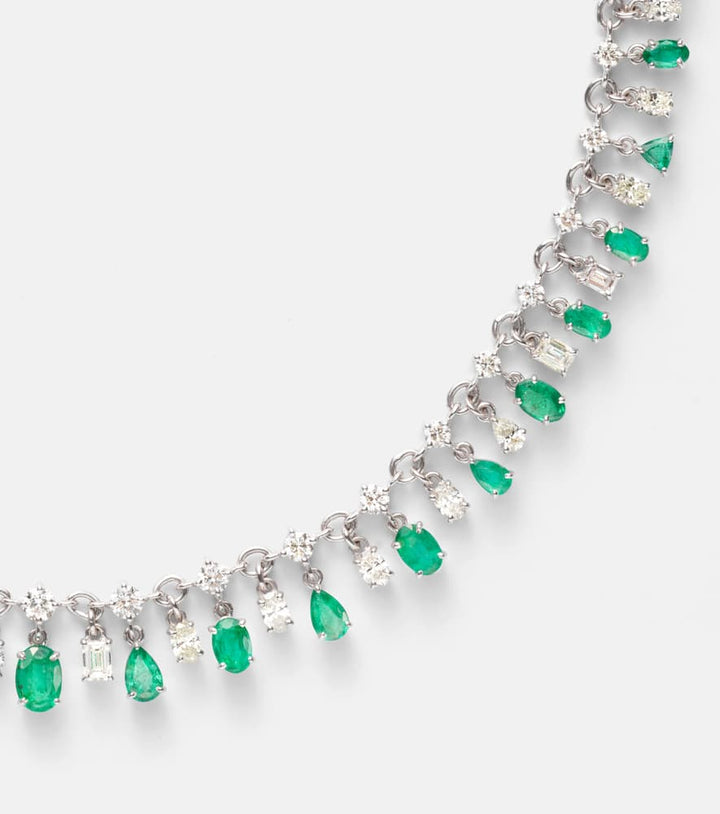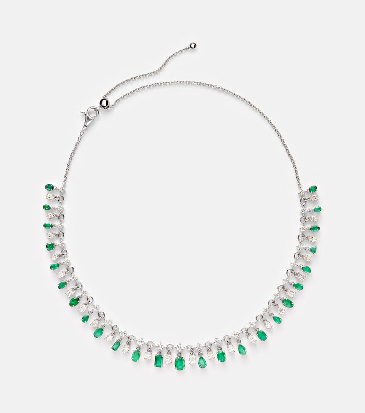 This adjustable necklace is made in India from 18kt white gold with a lobster-clasp fastening. It features 6.6 carats of natural round, oval, and cushion-cut diamonds, and 7.45 carats of natural oval, cushion, and pear-shaped emeralds. It has a min length of 31 cm (12 in), a max length of 45 cm (17.5 in), and a max width of 13 mm (0.5 in).