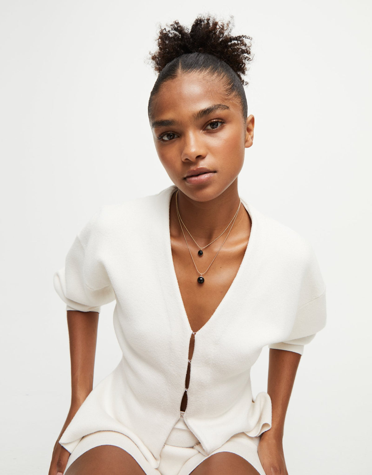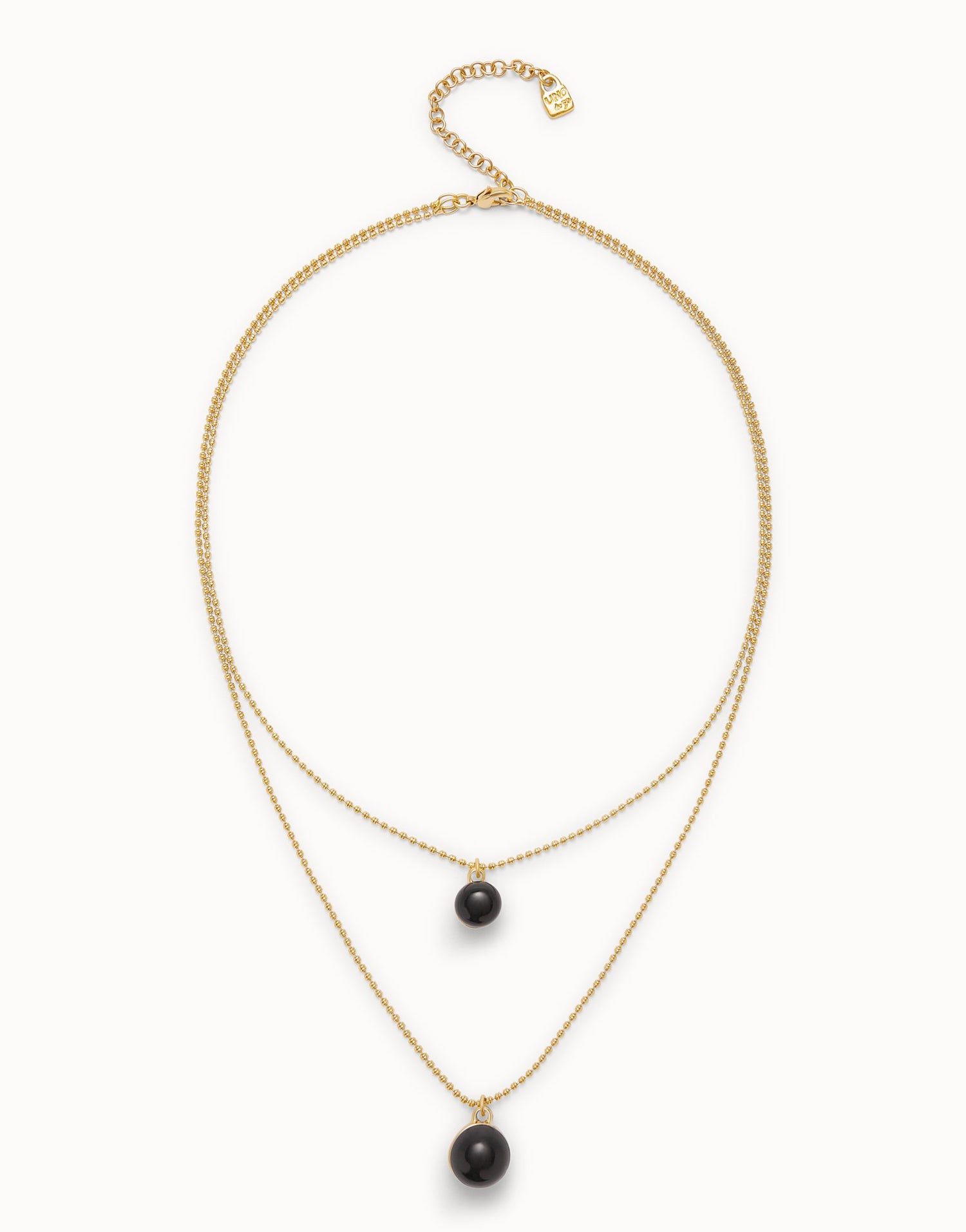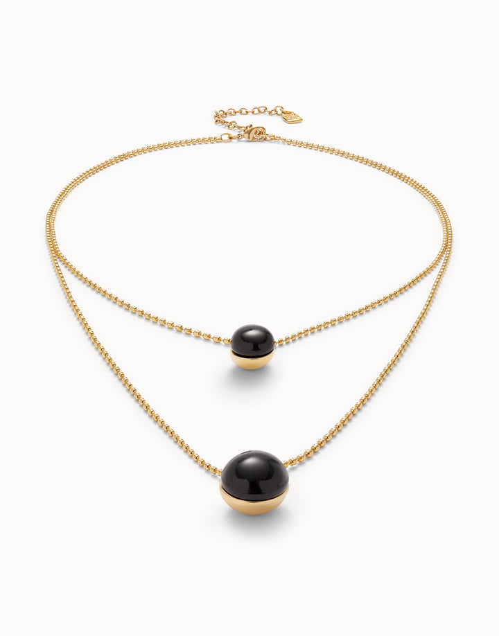 This Multi-layer Pendant Link Necklace with Black Murano Glass by UNOde50 features double 18K gold-plated chains with black Murano glass accents. Inspired by the Ser Fascinante collection, it captures enigmatic allure, natural magnetism, and bold personality. Handmade in Spain, the medium-length necklace layers beautifully, offering versatile styling and contemporary geometric elegance that enhances any ensemble.