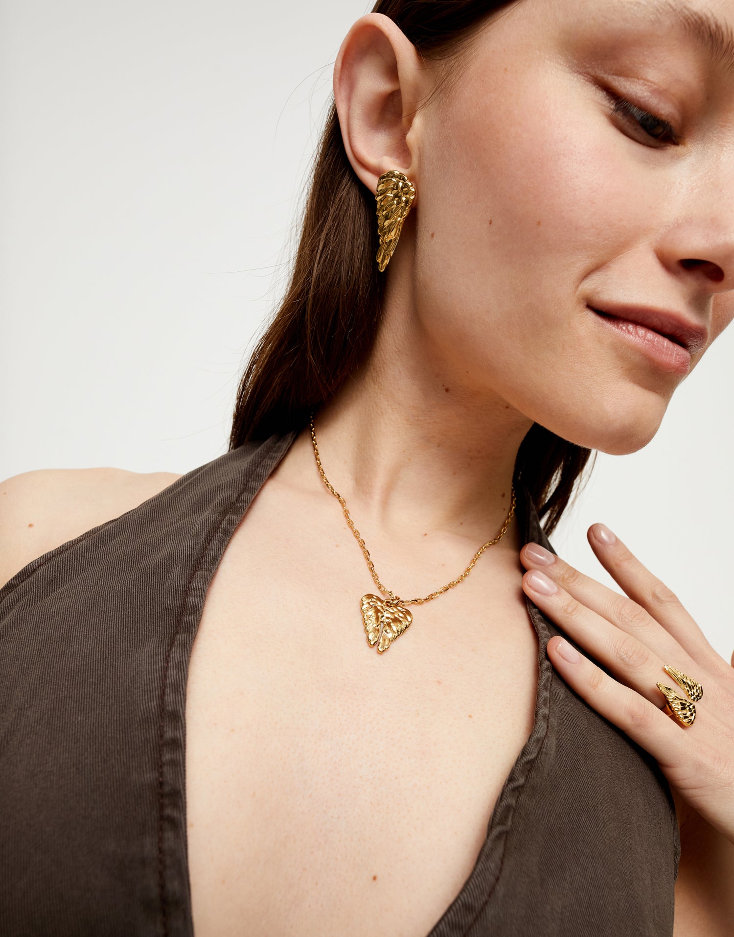 Medium-length gold-plated necklace with wing-shaped pendant. Adjustable length 41–45.5 cm. Weight 9.9 g. Handmade in Spain.