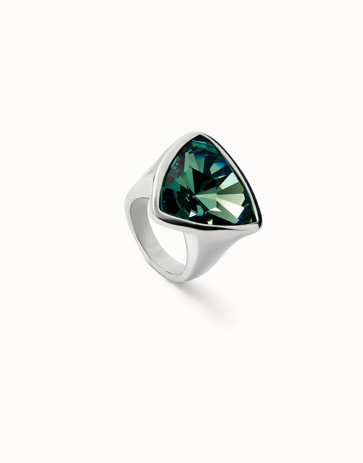 Large triangular sterling silver-plated ring with green faceted crystal. Diameter 18 mm. Handmade in Spain.