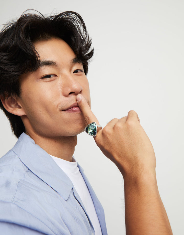 This Large Triangular Ring with Crystals by UNOde50 captures dynamic energy and bold individuality. Part of the Ser Camaleónica collection, its sterling silver-plated triangular design features a central green faceted crystal, creating vibrant reflections and playful elegance. Handmade in Spain, the ring balances statement presence with versatile wear, encouraging expressive layering or solo display. Its contemporary geometric silhouette merges craftsmanship with artistic expression, embodying resilience, creativity, and spirited self-expression. A striking accessory, it transforms the hand into a showcase of color, texture, and fearless sophistication.