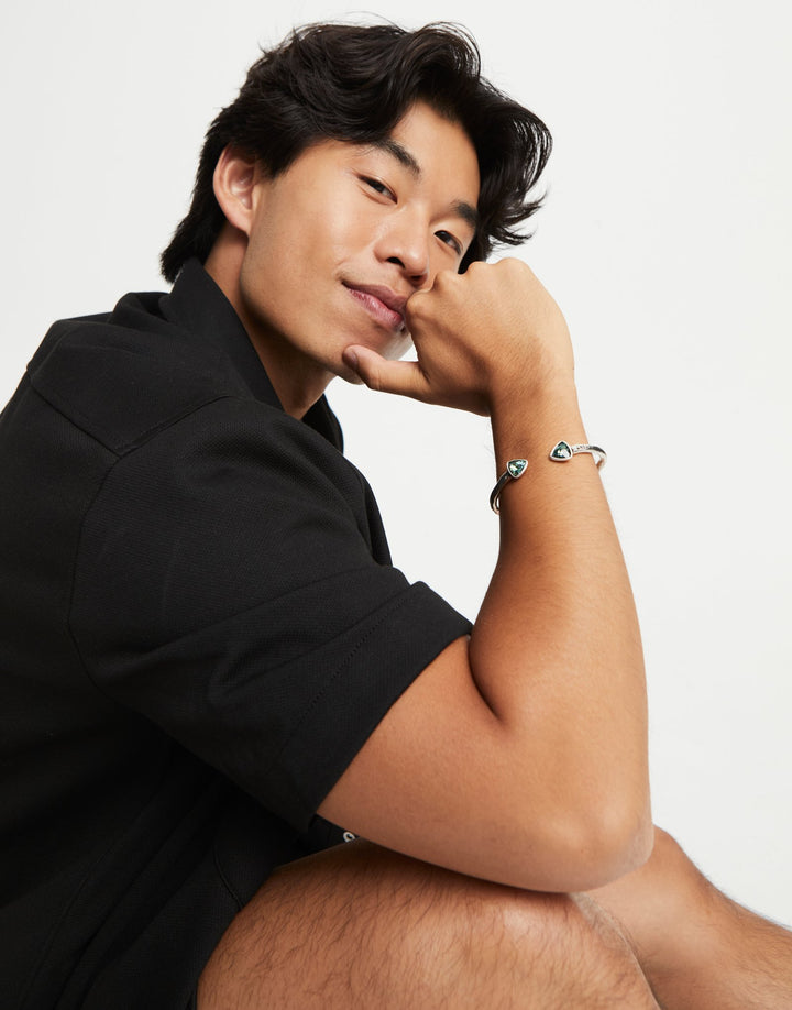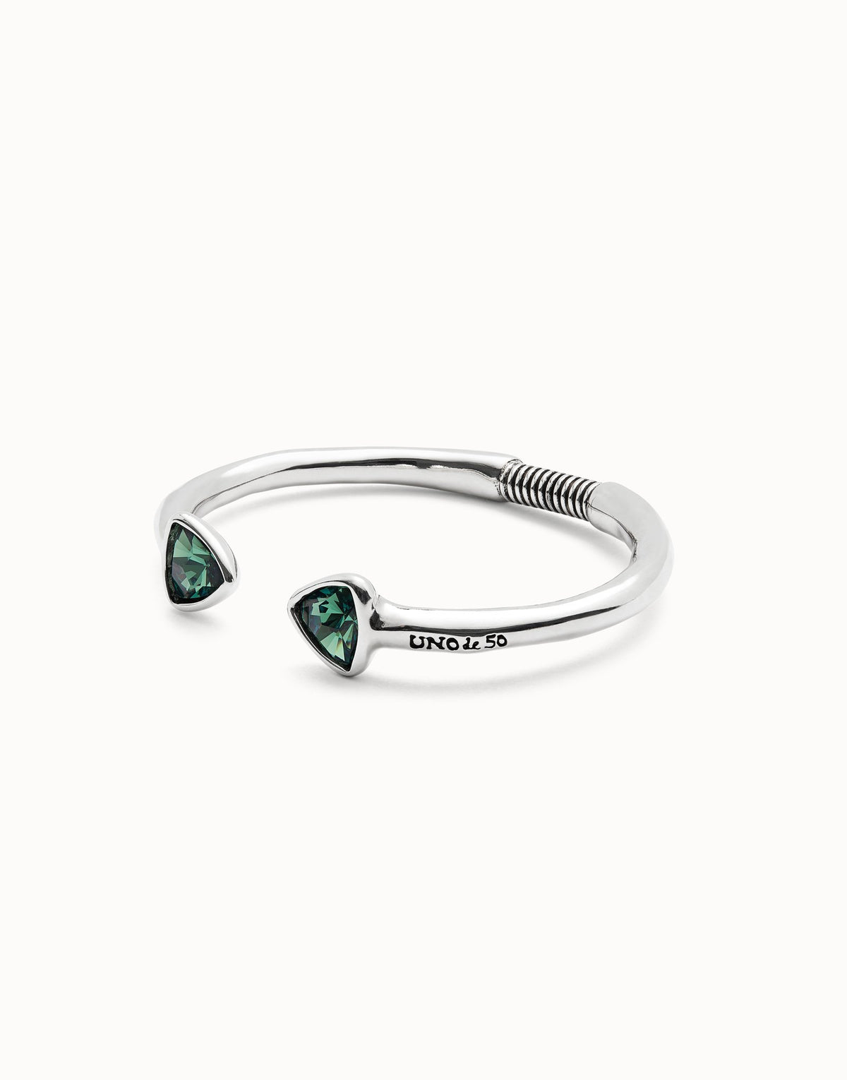 This Cuff Bracelet with Two Green Crystals by UNOde50 embodies vibrant energy and adaptable style. From the Ser Camaleónica collection, its rigid sterling silver-plated structure is accented with two faceted green crystals, reflecting light and creating dynamic visual impact. Handmade in Spain, the bracelet celebrates resilience, creativity, and fearless self-expression. Perfect for stacking or statement wear, it conveys individuality, playful sophistication, and contemporary artistry. A versatile accessory, it transforms the wrist into a lively display of color, geometric design, and bold craftsmanship.