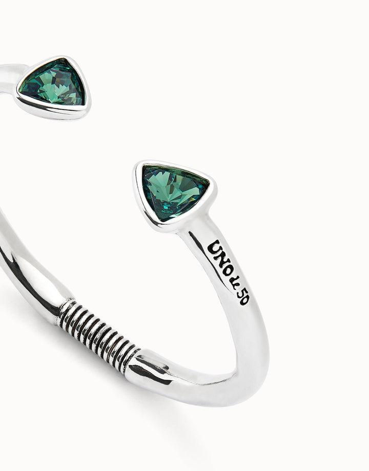 Rigid sterling silver-plated cuff bracelet with two green faceted crystals. Minimum perimeter 17.5 cm. Handmade in Spain.