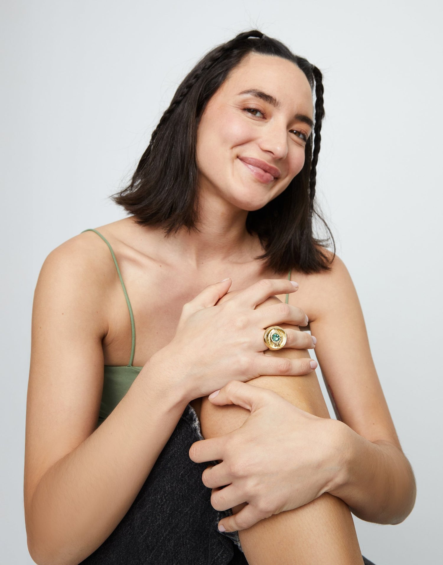 This Eye-Shaped Signet Ring with Faceted Green Crystal by UNOde50 radiates confidence and expressive elegance. From the Ser Intuitiva collection, its gold-plated structure features a central faceted green crystal, embodying visionary insight and mystical charm. Handmade in Spain, the ring’s sculptural design and substantial form create a statement accessory ideal for stacking or solo wear. With refined craftsmanship and contemporary artistry, it celebrates individuality, intuition, and bold personal expression. A versatile, meaningful piece, it allows the wearer to showcase their inner guidance while embracing modern, statement-making jewelry design.