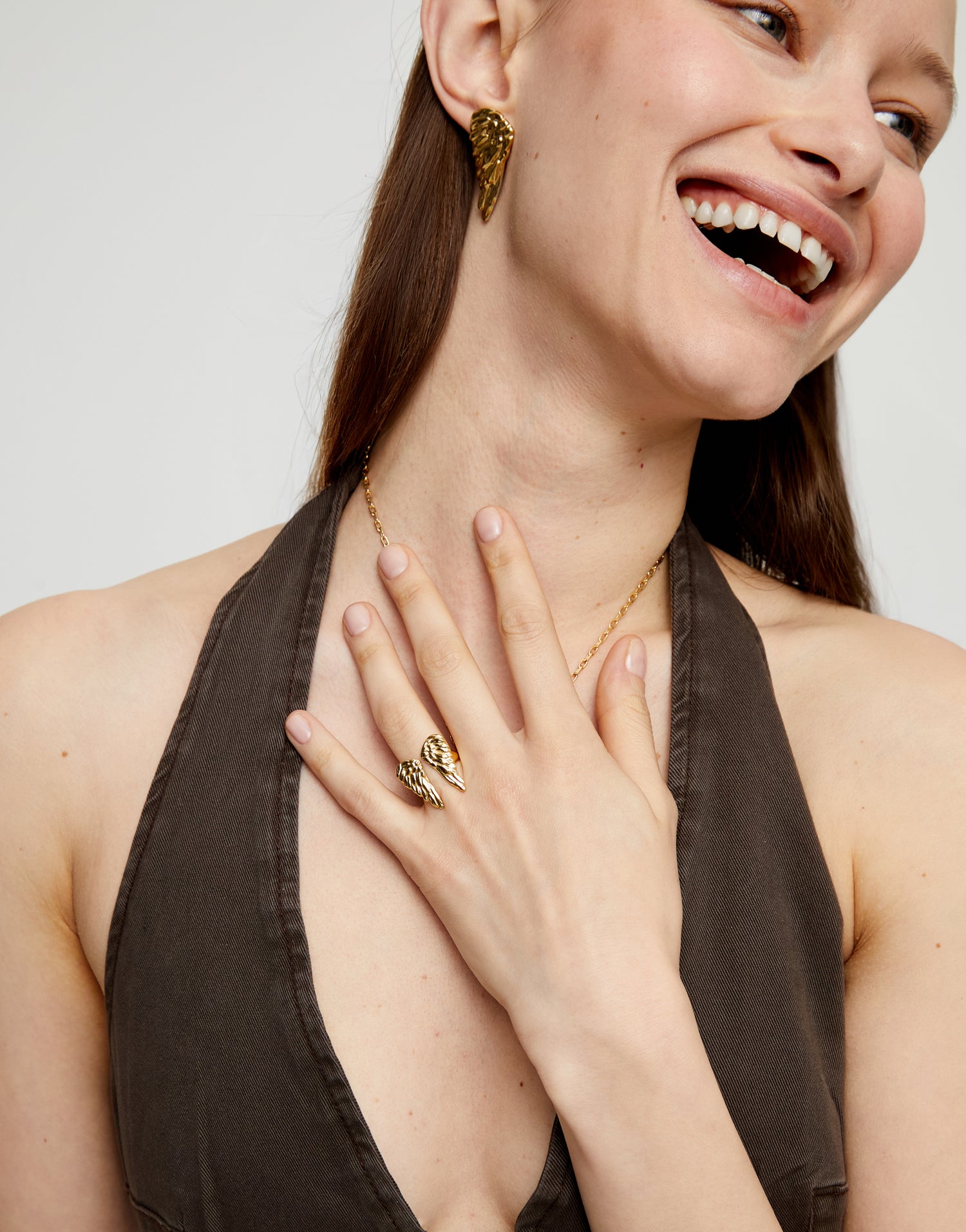 Open gold-plated ring with wing design. Diameter 19.4 mm. Minimum perimeter 61 mm. Weight 7.1 g. Handmade in Spain.