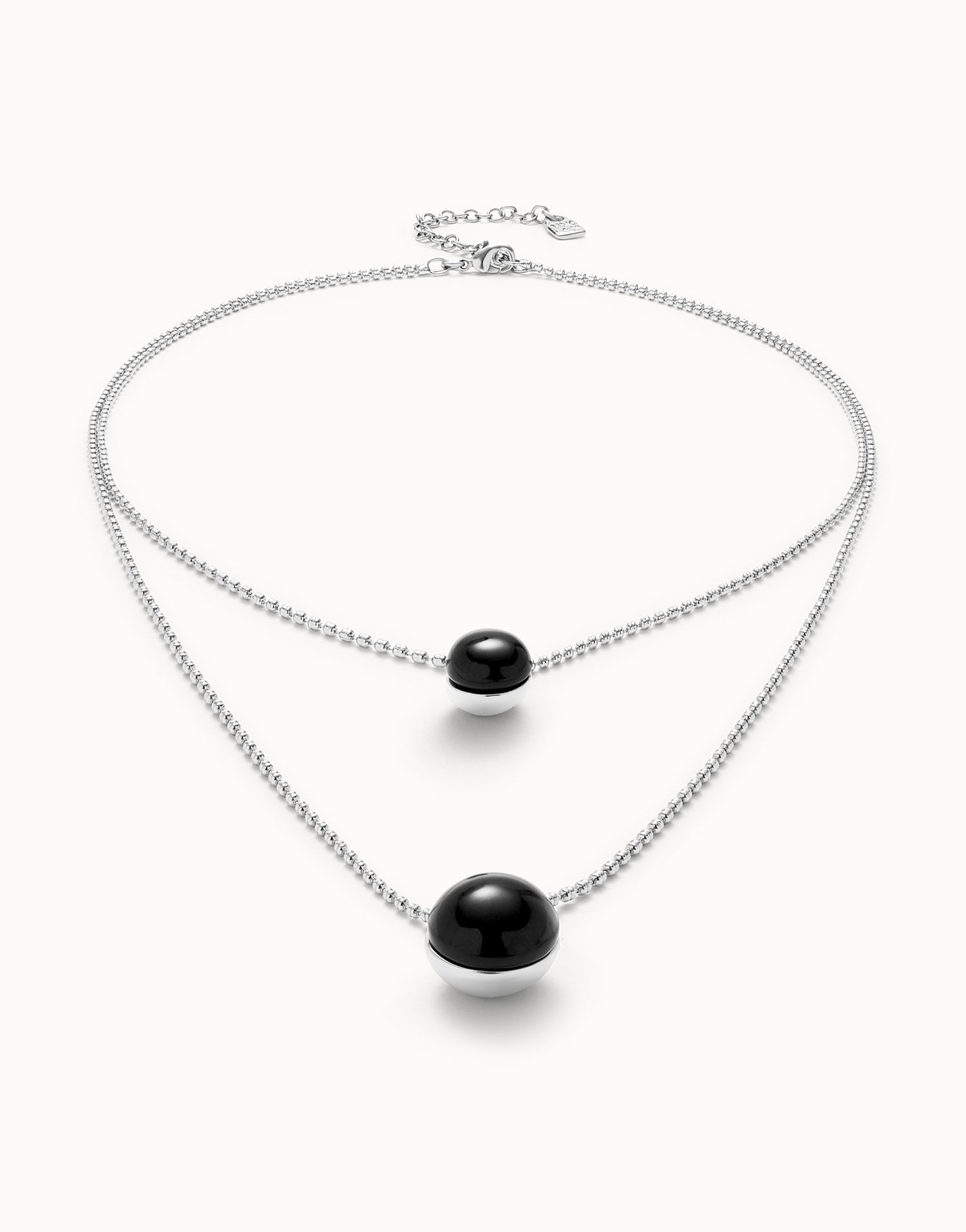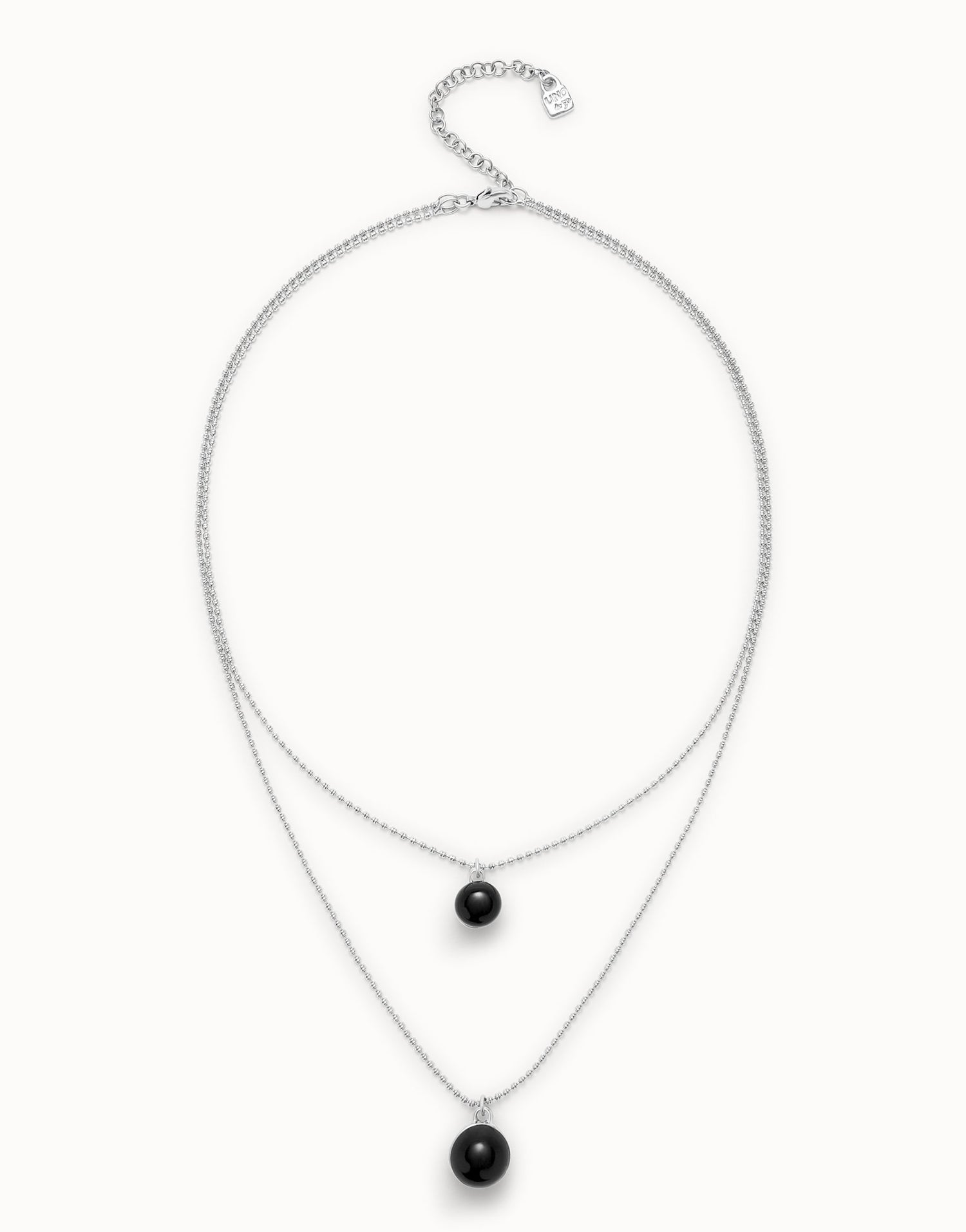 Multi-layer sterling silver-plated pendant link chain necklace with black Murano glass. Adjustable length 39.5–50.5 cm. Handmade in Spain.