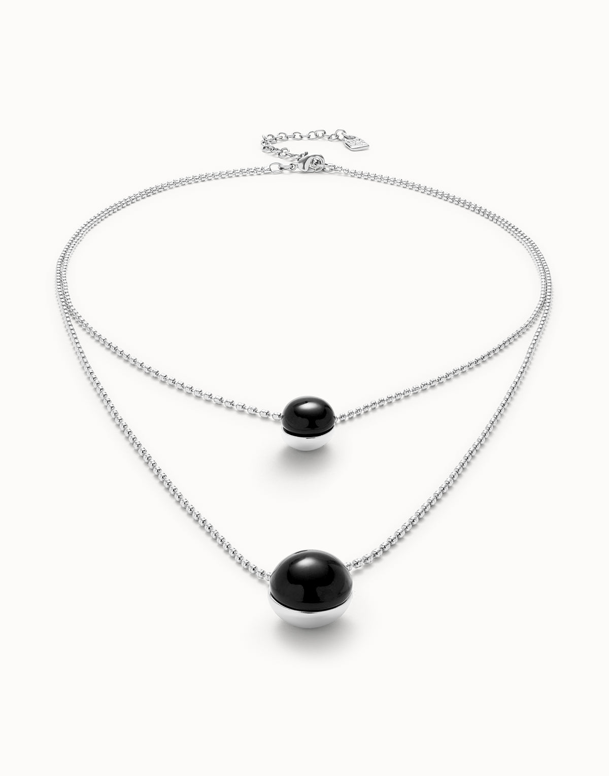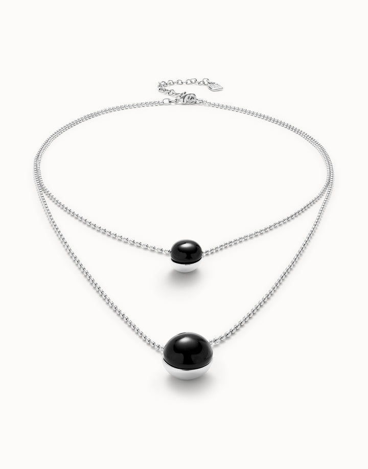 This Multi-Layer Pendant Link Chain Necklace with Black Murano Glass by UNOde50 exudes enigmatic elegance and magnetic charm. From the Ser Fascinante collection, its sterling silver-plated double chain features black Murano glass accents, reflecting mystery and captivating beauty. Handmade in Spain, the necklace embodies individuality, charisma, and playful sophistication. Ideal for statement wear or layered styling, it conveys artistry, intrigue, and contemporary design. A versatile accessory, it transforms the neckline into a display of mystique, craftsmanship, and expressive modern jewelry.