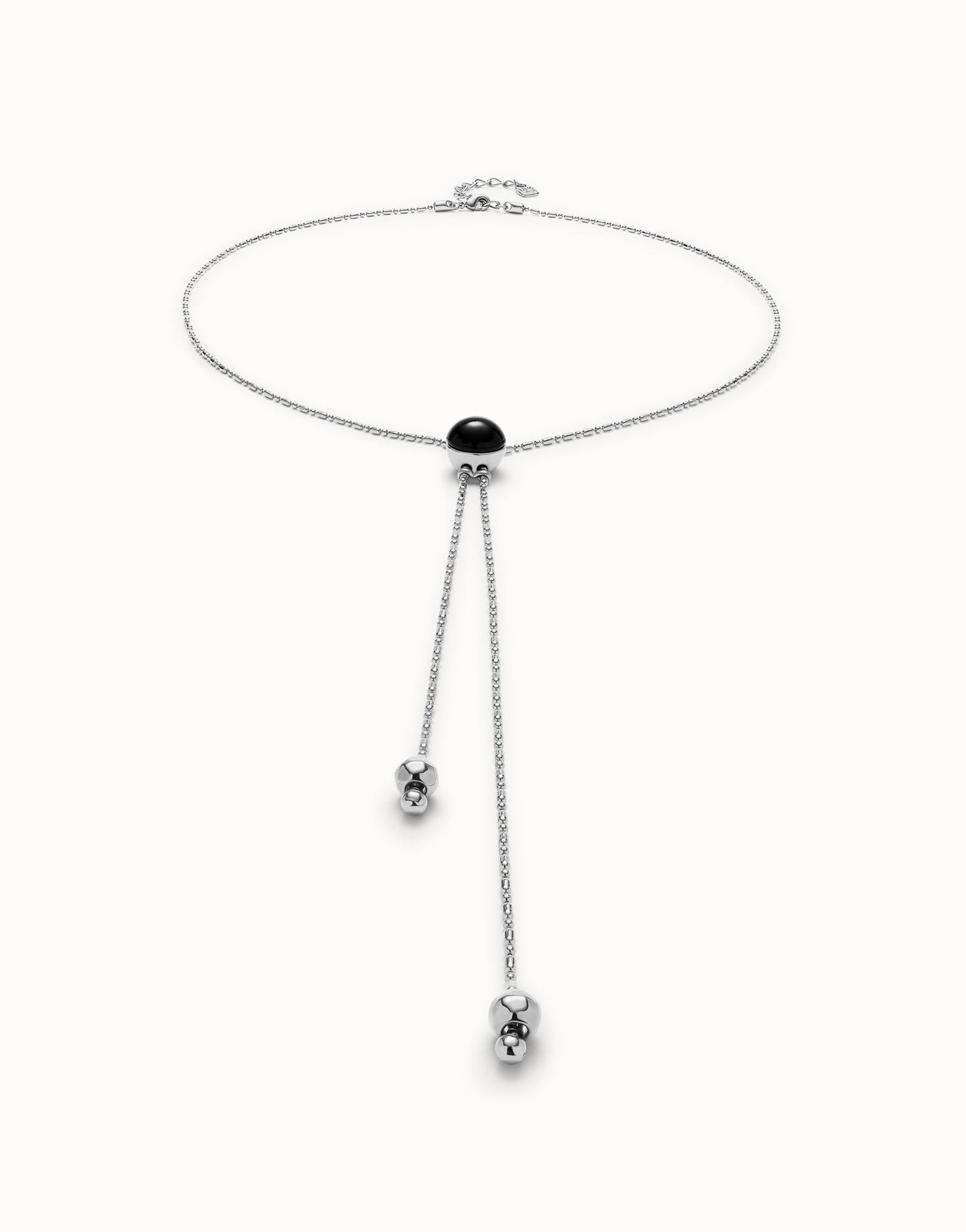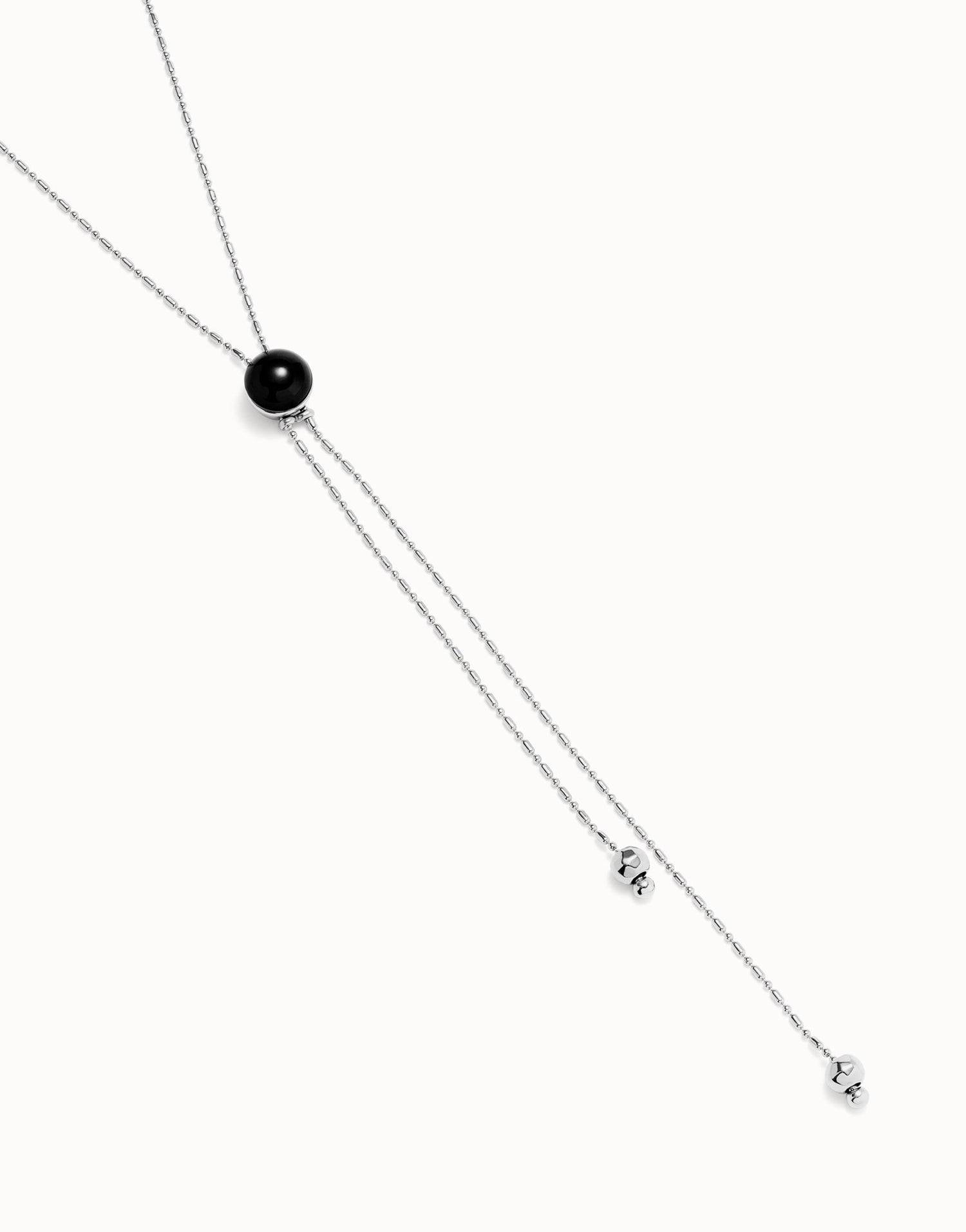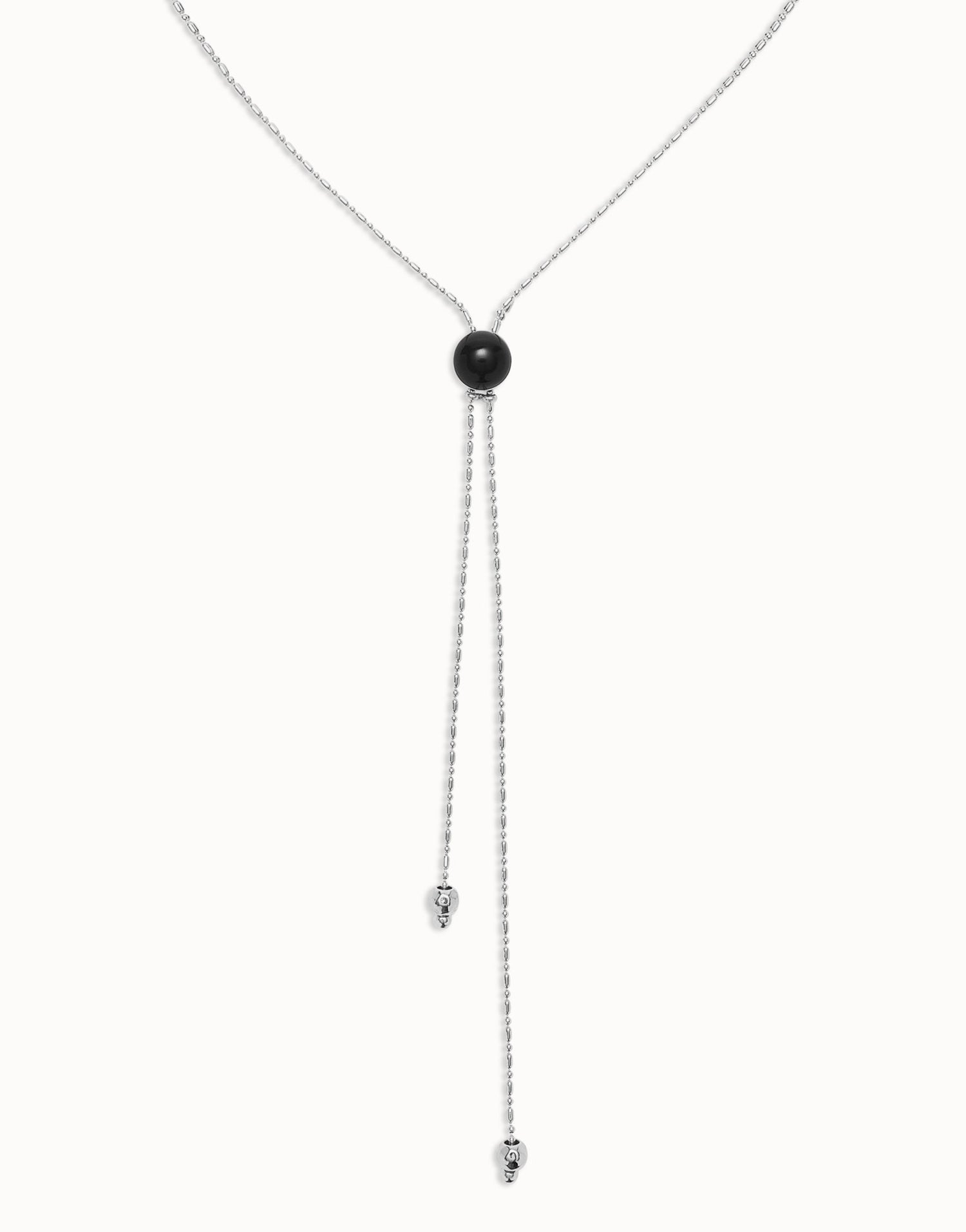 Long sterling silver-plated pendant necklace with central black Murano glass. Adjustable length 80–82.5 cm. Handmade in Spain.