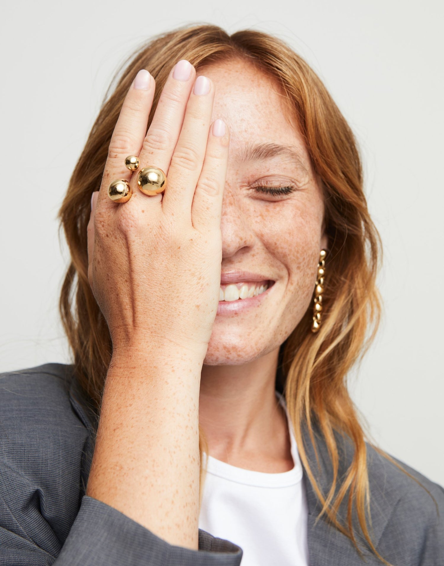 18K gold-plated ring with three bubble-shaped beads of different sizes. Diameter 18.2 mm. Handmade in Spain.