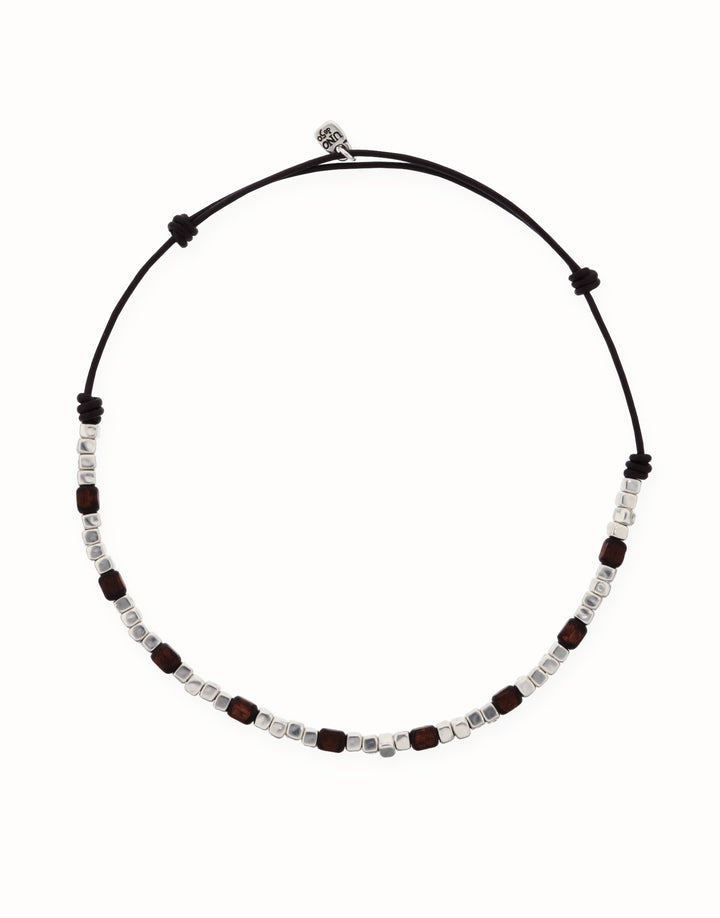 This Leather Necklace with Silver and Wooden Beads by UNOde50 embodies punk-inspired energy and rock & roll flair. From the Ser Imparable collection, it combines sterling silver and wooden beads along a leather cord, reflecting bold individuality and rebellious style. Handmade in Spain, the necklace encourages fearless self-expression, adventurous personality, and statement wear. Perfect for layered styling or solo display, it celebrates dynamic craftsmanship, contemporary design, and charismatic aesthetics. A striking accessory, it transforms the neckline into a showcase of attitude, energy, and modern artistic jewelry.