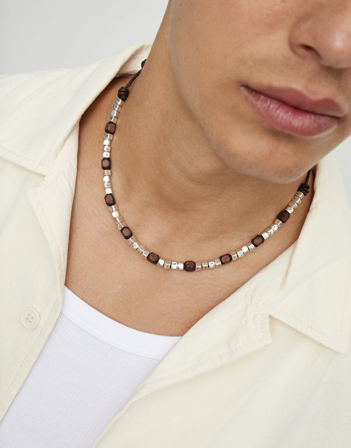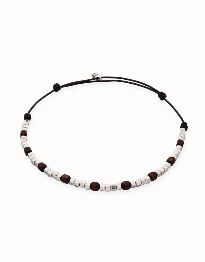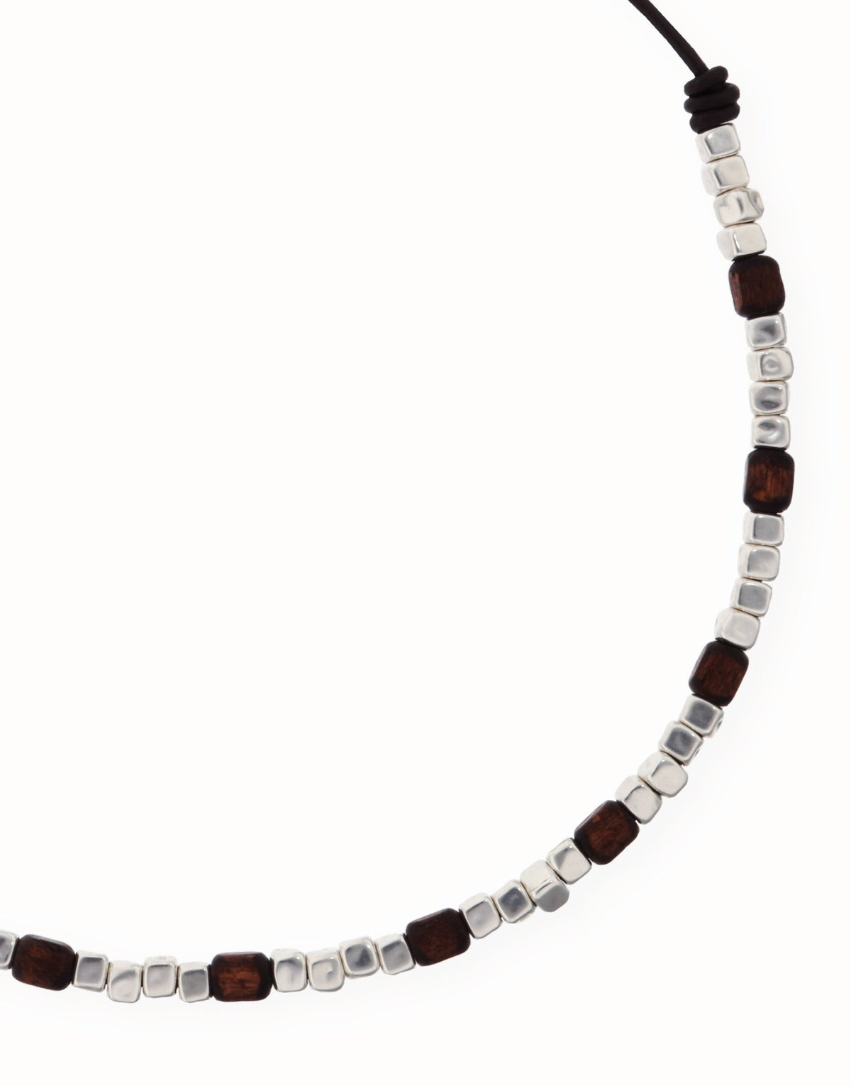 Leather necklace with sterling silver and wooden beads. Adjustable length 50–60 cm. Weight 23.2 g. Handmade in Spain.