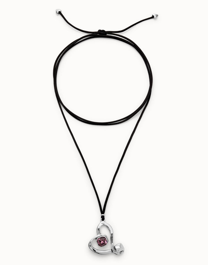 This Long Pendant Necklace with Central Heart and Pink Crystal by UNOde50 is a radiant expression of emotional transparency and contemporary elegance. From the Ser Expresiva collection, its sterling silver-plated leather chain showcases a central heart accented with a pink faceted crystal, symbolizing openness, passion, and bold self-expression. Handmade in Spain, the necklace embodies creativity, individuality, and fearless style. Ideal for layering or solo wear, it transforms the neckline into a striking display of craftsmanship, geometric charm, and modern artistry, reflecting the wearer’s vibrant personality and playful approach to expressive jewelry.