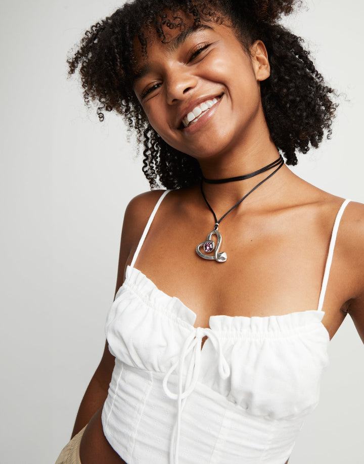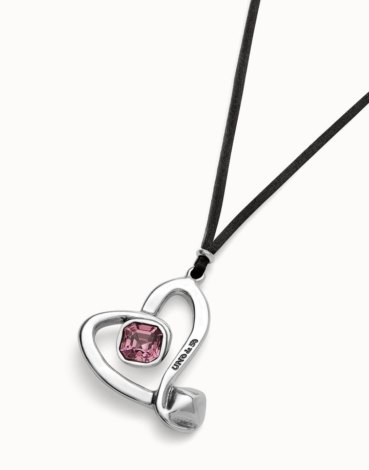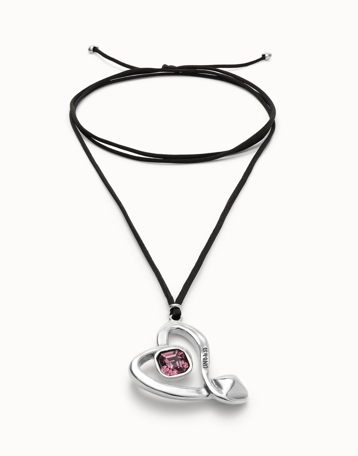 Long sterling silver-plated leather pendant necklace with central heart and pink faceted crystal. Handmade in Spain.