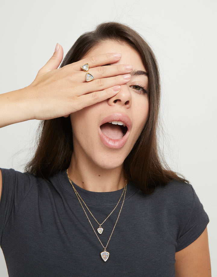18K gold-plated triangular ring with two multicolored faceted crystals. Diameter 18.8 mm. Handmade in Spain.