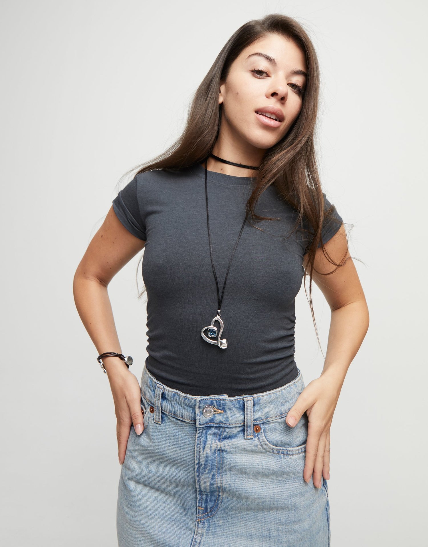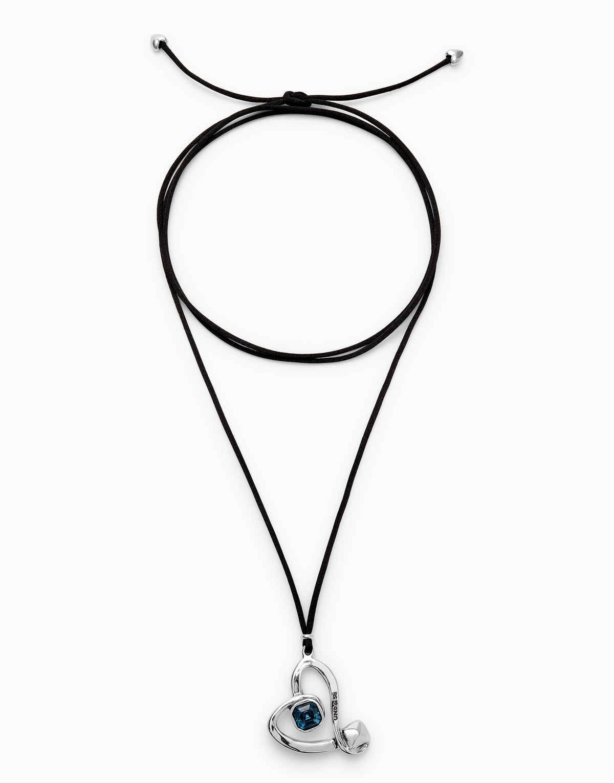 This Long Pendant Necklace with Central Heart and Blue Crystal by UNOde50 radiates bold elegance and expressive charm. From the Ser Expresiva collection, its sterling silver-plated leather cord showcases a central heart accented with a blue faceted crystal, symbolizing openness, clarity, and vibrancy. Handmade in Spain, the necklace celebrates self-expression, modern artistry, and fearless individuality. Perfect for layering or statement wear, it transforms the neckline into a captivating display of contemporary craftsmanship, geometric sophistication, and vibrant design.
