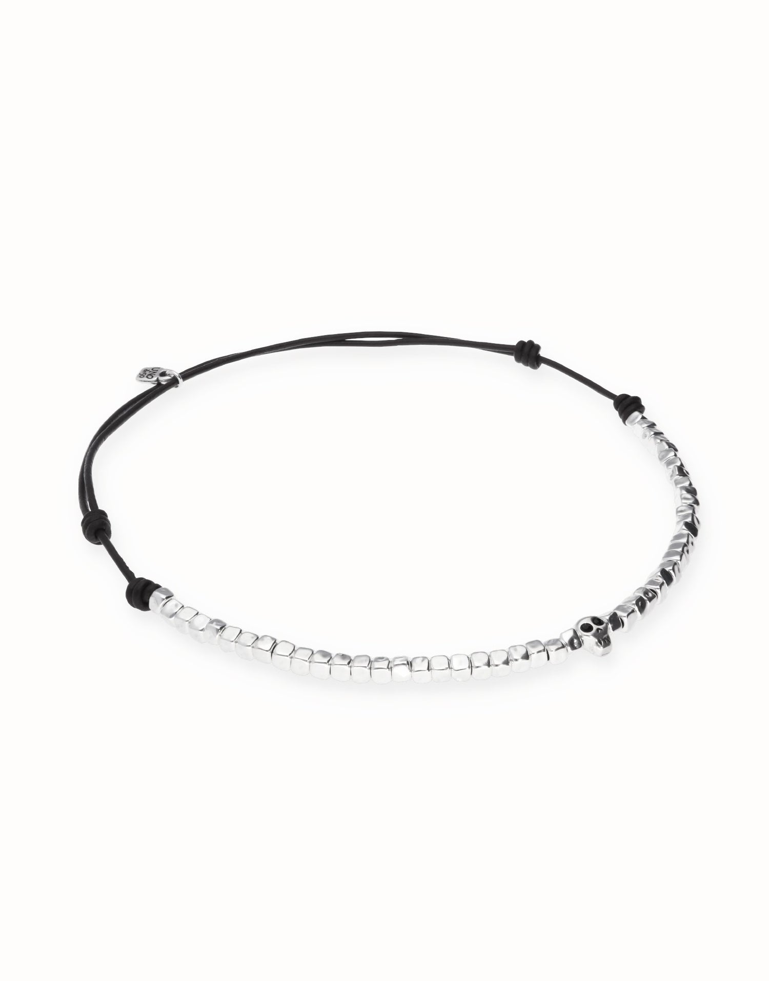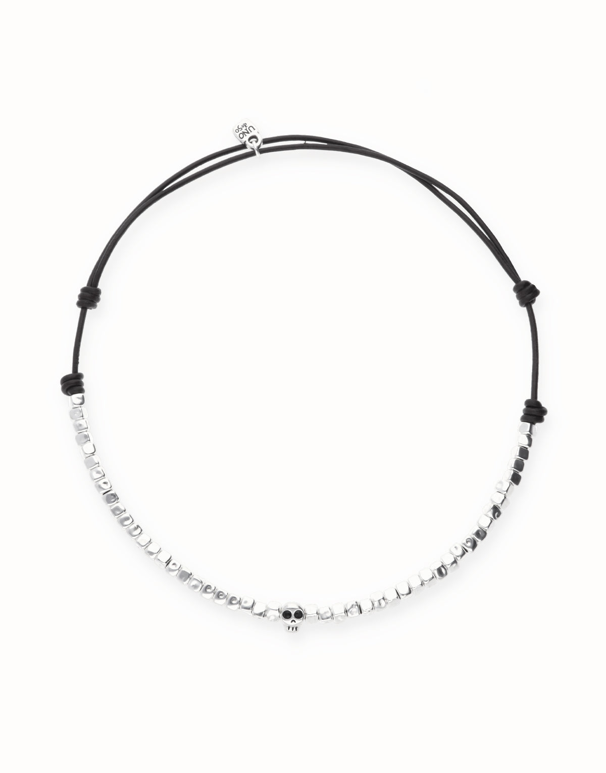 Leather necklace with sterling silver and wooden beads with skull accents. Adjustable length 50–60 cm. Weight 29.5 g. Handmade in Spain.