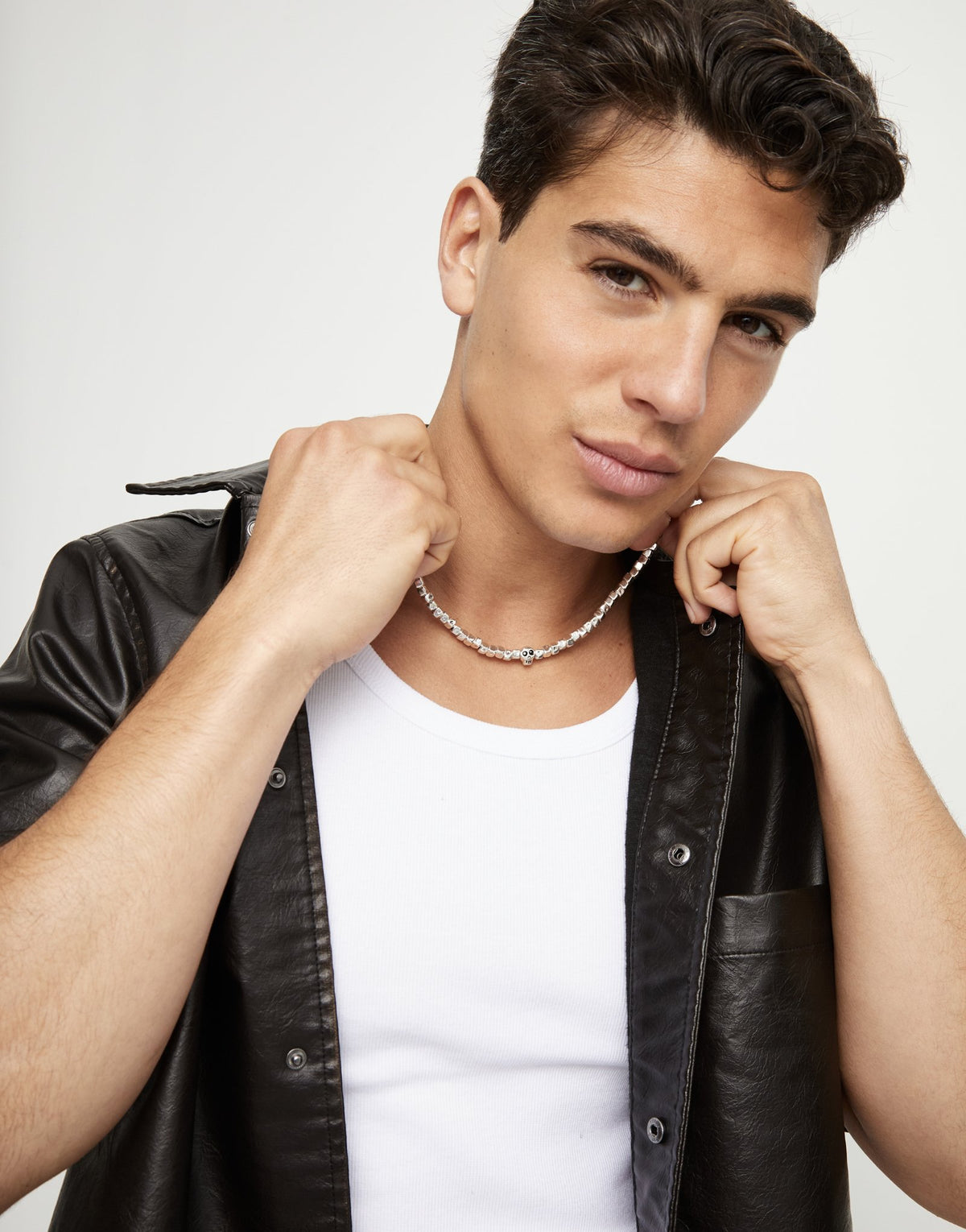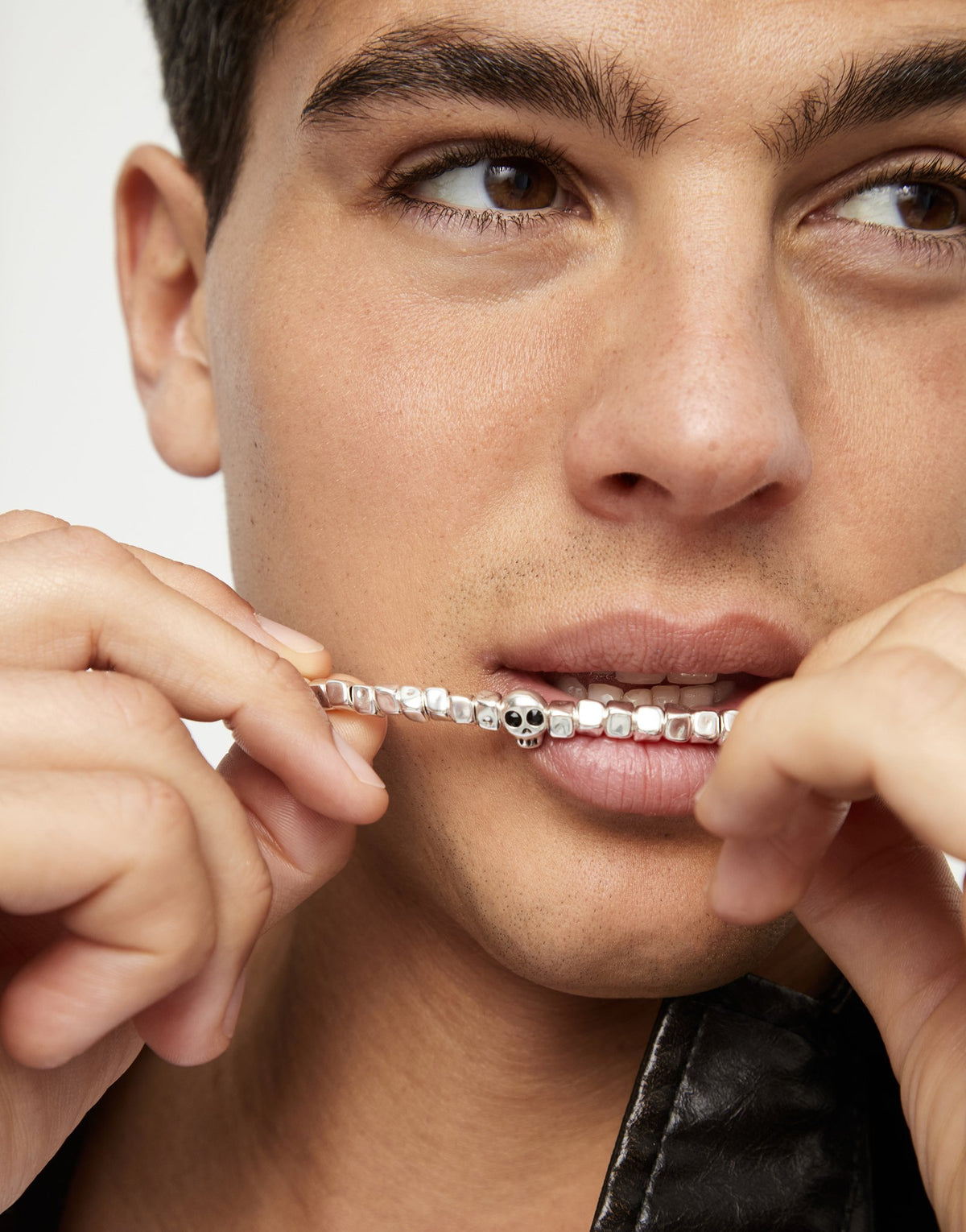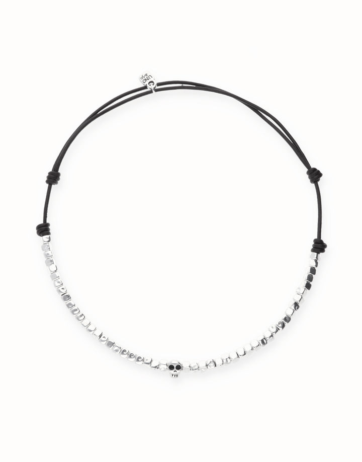 This Leather Necklace with Beads and Skull Detail by UNOde50 exudes punk energy, rock & roll sophistication, and fearless self-expression. From the Ser Imparable collection, its leather cord is adorned with sterling silver and wooden beads featuring skull accents, celebrating rebellious charm and bold individuality. Handmade in Spain, the necklace is ideal for statement wear or layering, embodying dynamic style, craftsmanship, and edgy design. A striking accessory, it transforms the neckline into a display of attitude, creativity, and contemporary jewelry artistry.