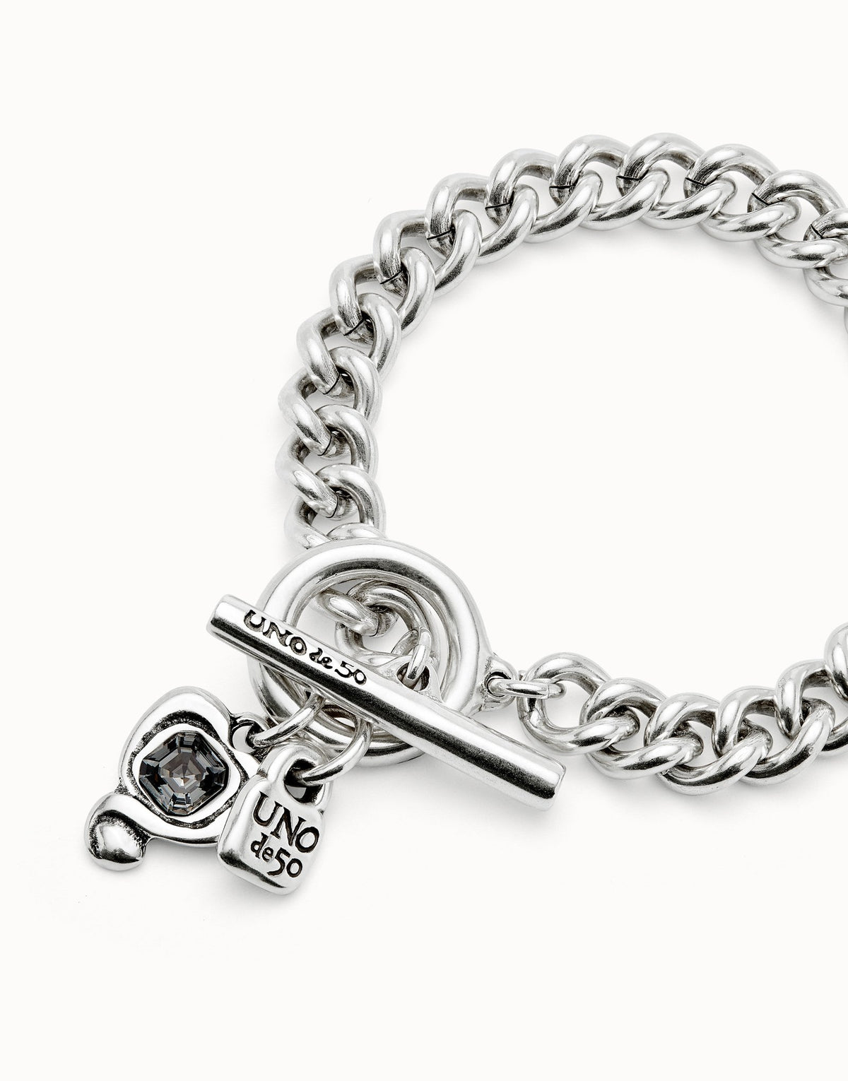 This Curb Link Chain Bracelet with Charms by UNOde50 radiates playful expression and vibrant personality. From the Ser Expresiva collection, its sterling silver-plated chain features a heart and black faceted crystal, symbolizing passion, honesty, and creativity. Handmade in Spain, the bracelet embodies bold self-expression, contemporary artistry, and statement wear. A versatile accessory, it transforms the wrist into a display of craftsmanship, geometric charm, and dynamic modern jewelry.