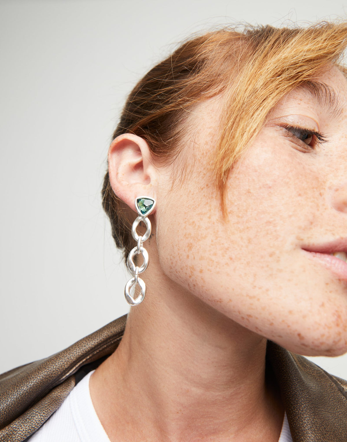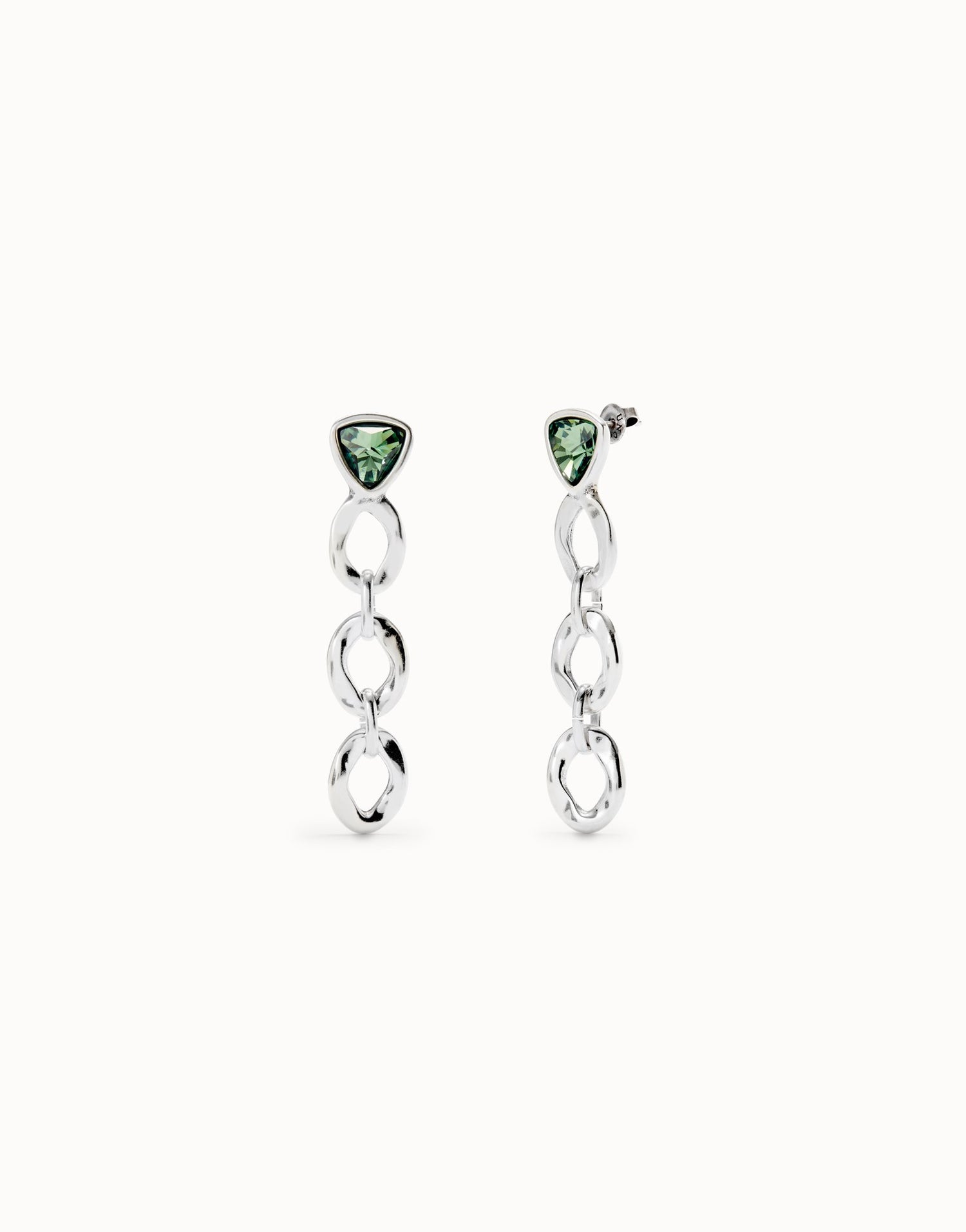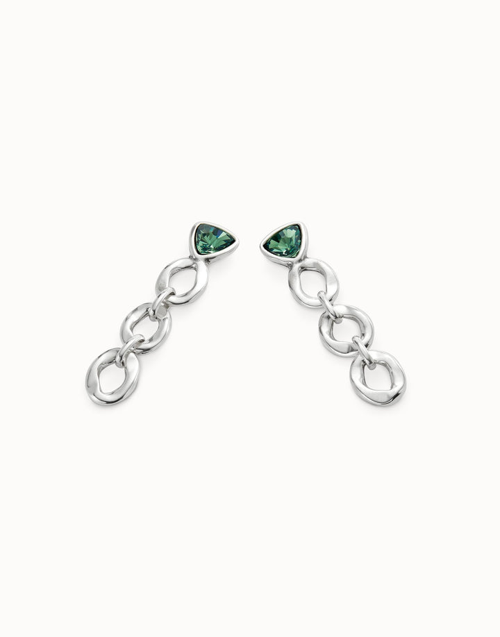 Long sterling silver-plated drop earrings with linked components and triangular green faceted crystals. Minimum length 6 cm. Handmade in Spain.