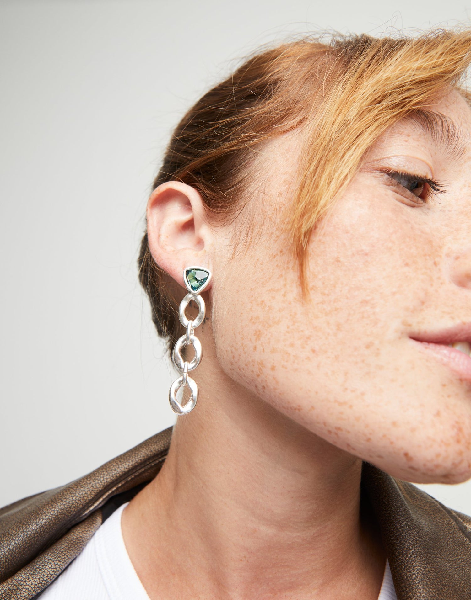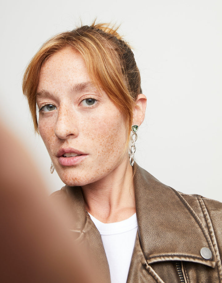 These Drop Earrings with Green Crystal by UNOde50 are a vibrant statement of kaleidoscopic energy and contemporary style. From the Ser Camaleónica collection, their long sterling silver-plated design features linked components ending with triangular green faceted crystals. Handmade in Spain, the earrings embody bold self-expression, versatile wear, and artistic craftsmanship. Perfect for statement styling, they transform the earlobes into a showcase of color, dynamic design, and modern jewelry sophistication.