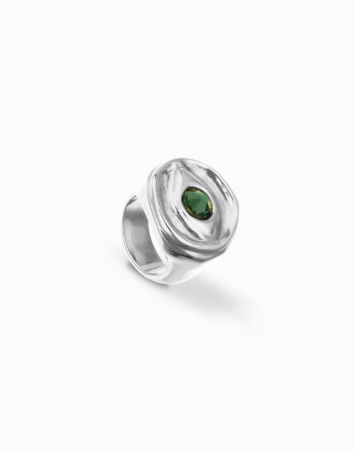 Silver eye-shaped signet ring with faceted green crystal. Minimum perimeter 55 mm. Weight 26.6 g. Handmade in Spain.
