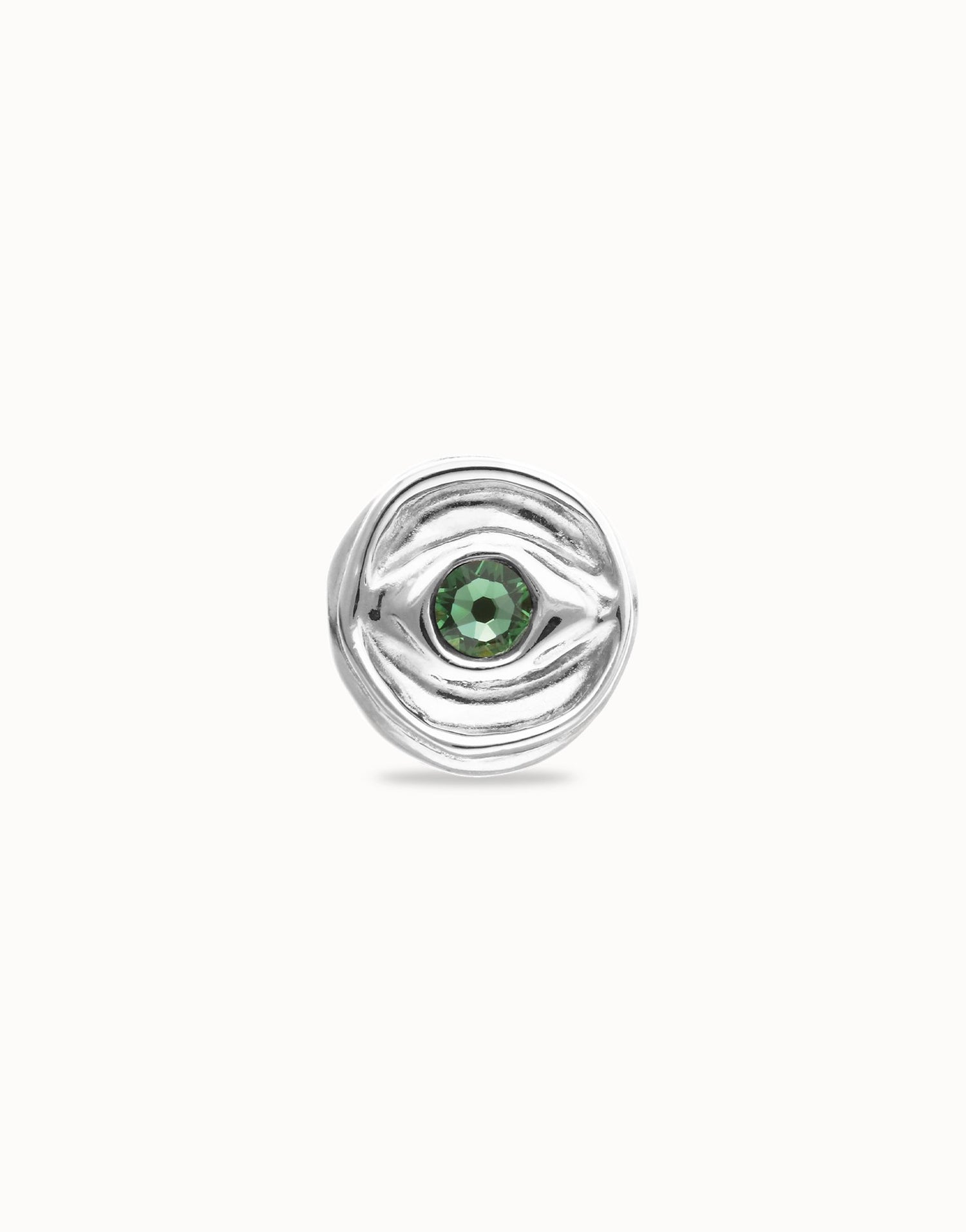 Silver eye-shaped signet ring with faceted green crystal. Minimum perimeter 58 mm. Weight 27 g. Handmade in Spain.
