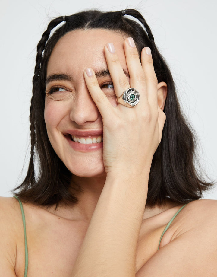 This Eye-Shaped Signet Ring with Faceted Green Crystal by UNOde50 combines geometric sophistication with symbolic elegance. From the Ser Intuitiva collection, its silver design features a central faceted green crystal, representing intuition, insight, and visionary style. Handmade in Spain, the ring is perfect for layered or statement wear, reflecting craftsmanship, contemporary design, and bold self-expression. It transforms the hand into a striking display of individuality, artistic flair, and modern jewelry aesthetics.