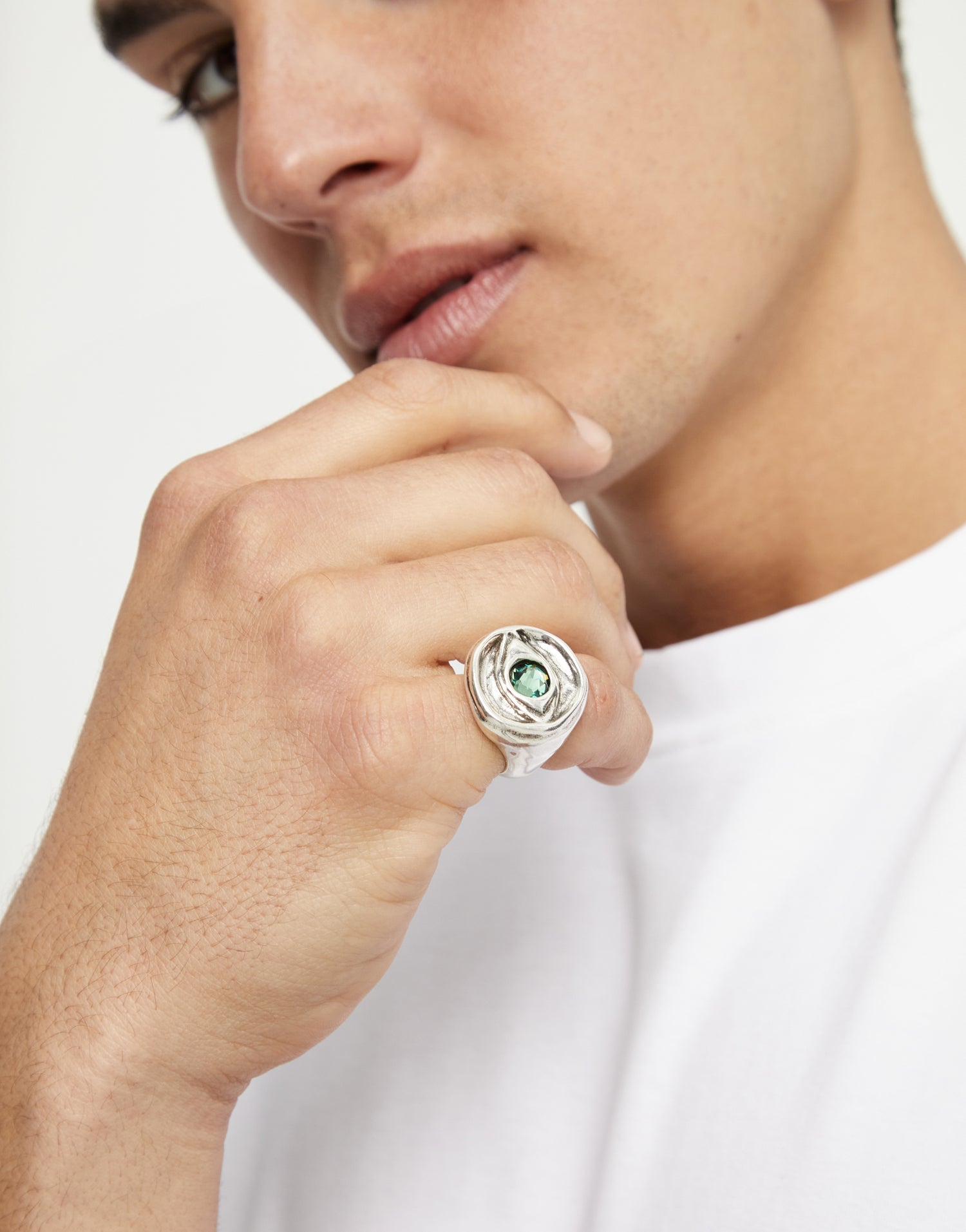 Silver eye-shaped signet ring with faceted green crystal. Minimum perimeter 61 mm. Weight 27.4 g. Handmade in Spain.