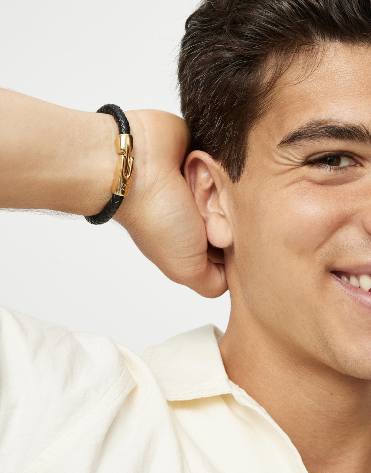 Black braided leather bracelet with 18k gold-plated metal alloy clasp, minimum perimeter 17.5 cm, weight 16.6 g.