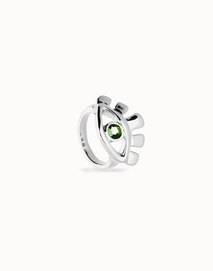 Sterling silver-plated eye-shaped ring with faceted green crystal, minimum perimeter 58 mm, weight 8.3 g.