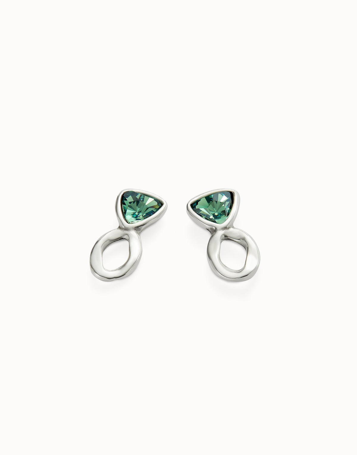 Sterling silver-plated drop earrings with triangular green crystals, minimum length 2.7 cm.