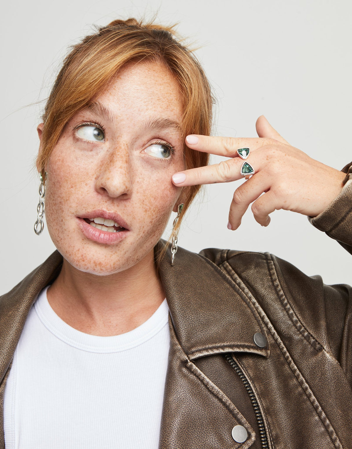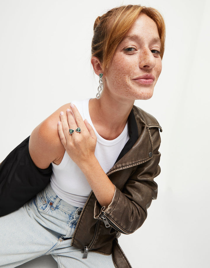 This Triangular Ring by UNOde50 features two vibrant green faceted crystals set on a geometric triangular frame, reflecting versatility and adaptability. Part of the Ser Camaleónica collection, it celebrates playful sophistication and the wearer’s dynamic personality. The design encourages reinvention and bold expression, offering a kaleidoscopic effect as the crystals catch the light. Ideal for stacking or wearing as a statement piece, it conveys resilience, creativity, and the joy of embracing change with elegance and charm, perfectly capturing the collection’s transformative spirit.