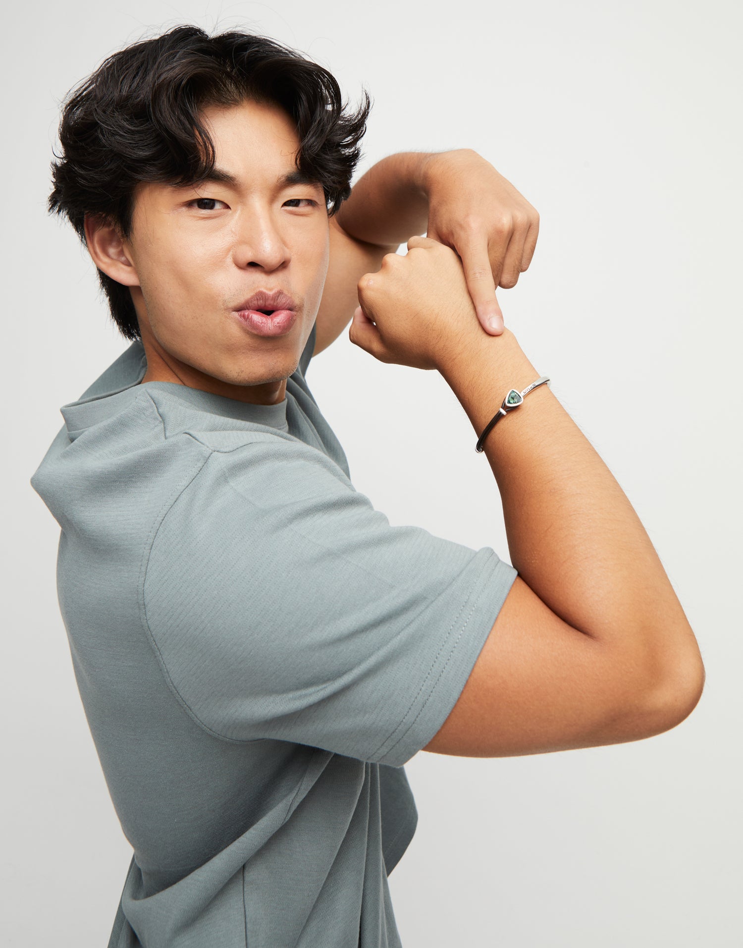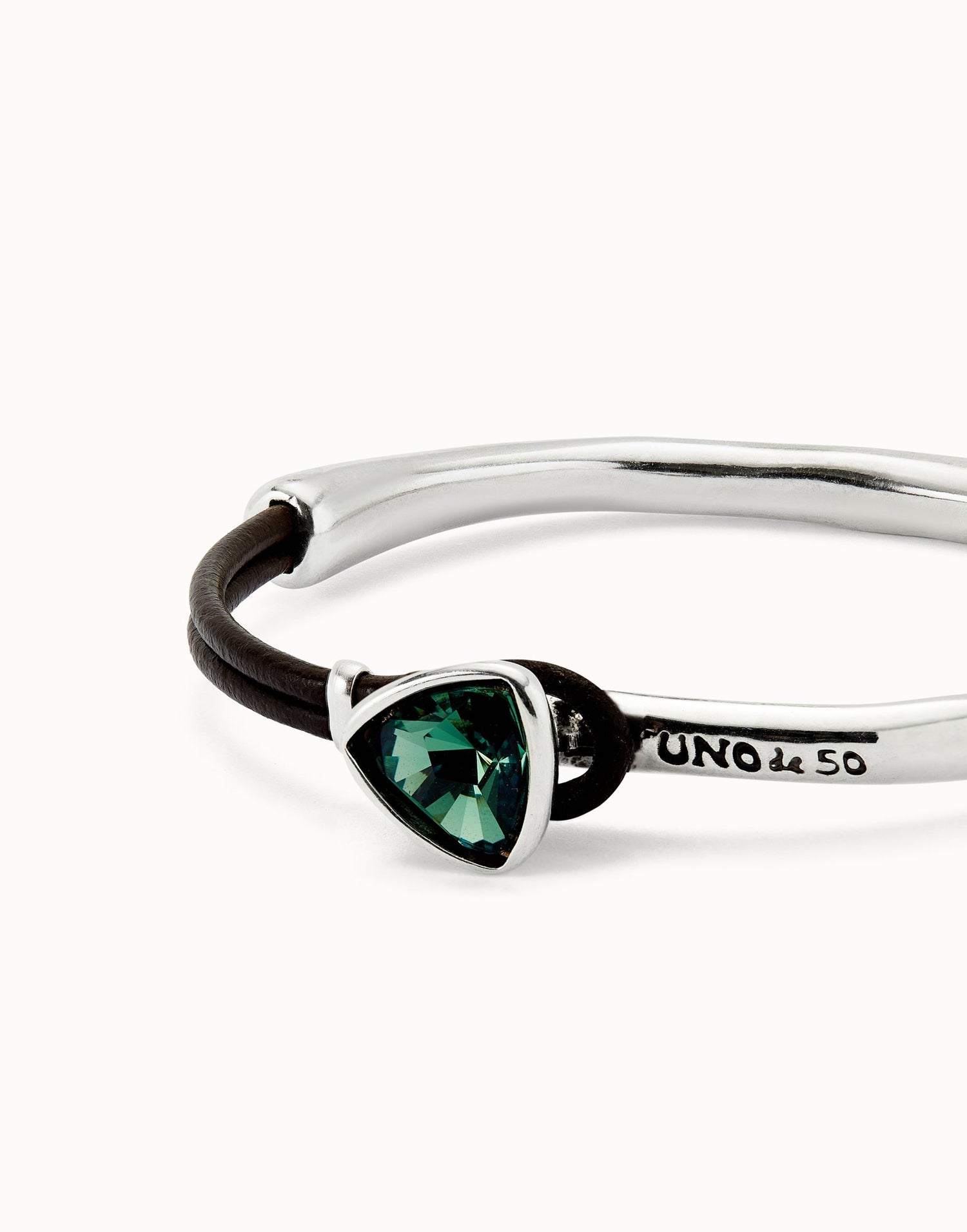 This Bangle Bracelet by UNOde50 combines fine sterling silver-plated metal with supple leather and a central green faceted crystal, creating a harmonious balance of texture and color. From the Ser Camaleónica collection, it embodies versatility, adaptability, and playful sophistication. Perfect for layering with other bracelets or wearing as a statement piece, it highlights resilience and individuality. The artisan’s meticulous handmade process ensures a unique, high-quality design, capturing the collection’s kaleidoscopic essence and the wearer’s dynamic personality in a striking, contemporary accessory.