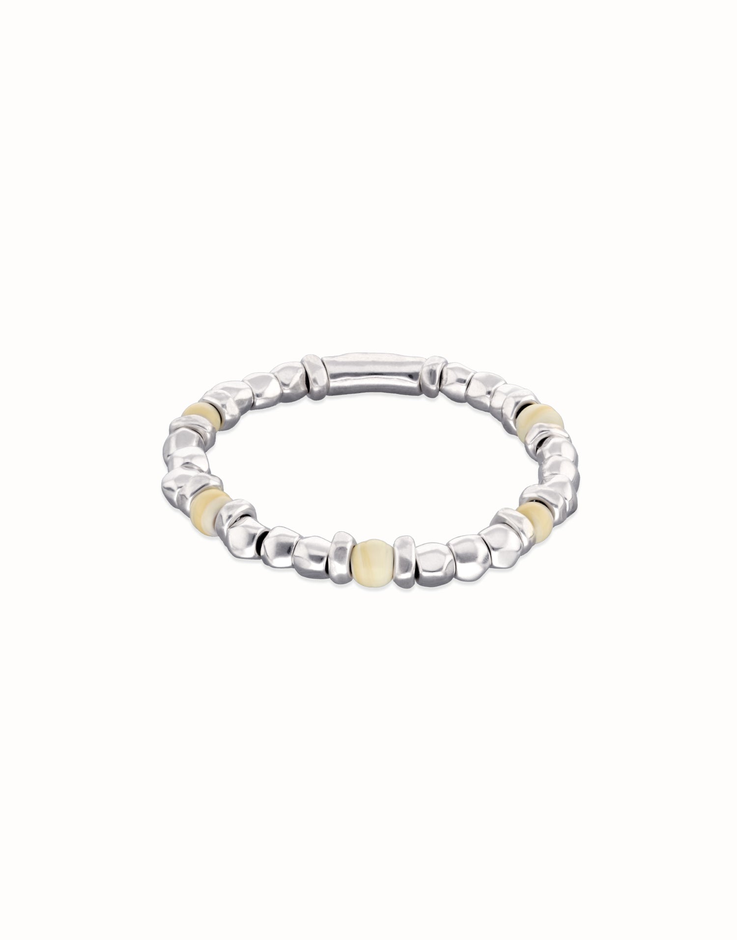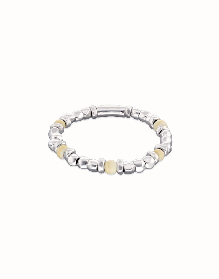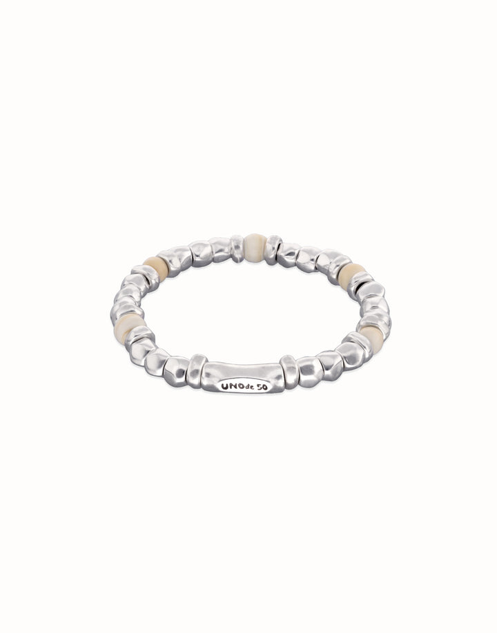 This Beaded Bracelet by UNOde50 features silver and ivory beads on an elastic band, offering a striking contrast and rock-inspired elegance. Part of the Ser Imparable collection, it celebrates fearless attitude, unstoppable energy, and punk aesthetic. Each bead is carefully handcrafted, reflecting artisanal quality and attention to detail. Perfect for layering or statement wear, the bracelet conveys individuality, boldness, and contemporary sophistication, transforming natural materials into a wearable symbol of attitude, adventure, and modern rock style.