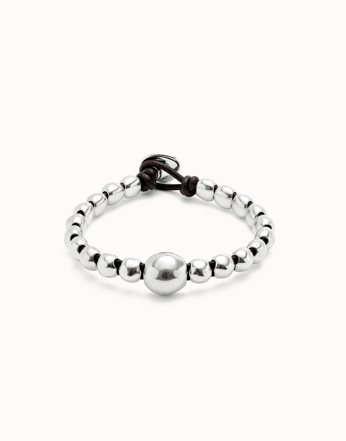 This Leather Bracelet with a Large Bead by UNOde50 celebrates courage and bold self-expression as part of the Ser Intrépida collection. Its sterling silver-plated beads and central larger bead create a tactile, visually engaging statement. Handmade in Spain, this bracelet embodies the collection’s philosophy of living fearlessly and embracing adventurous styling, allowing the wearer to mix metals, layer creatively, and express their individuality. Each bead’s subtle variations highlight artisanal craftsmanship, turning a simple bracelet into a versatile symbol of determination, energy, and fearless creativity.