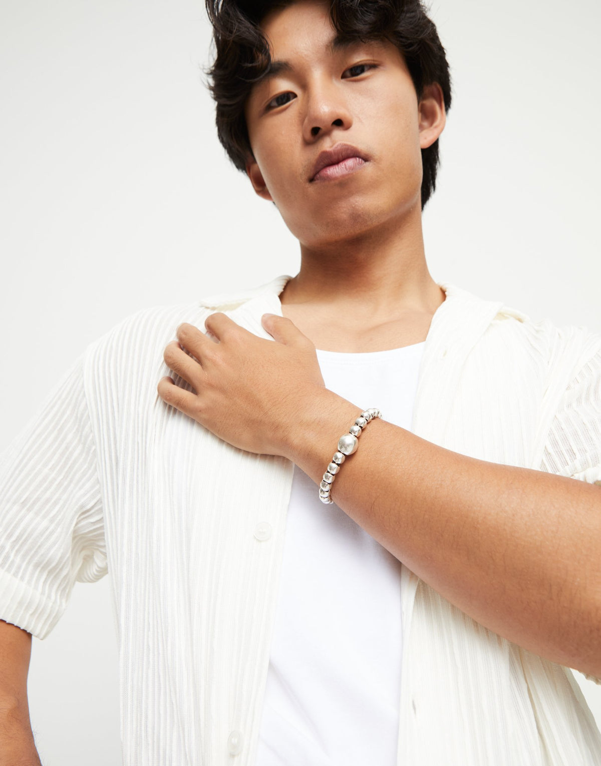 Handcrafted in sterling silver-plated metal, central large bead, designed for flexible wrist fit.