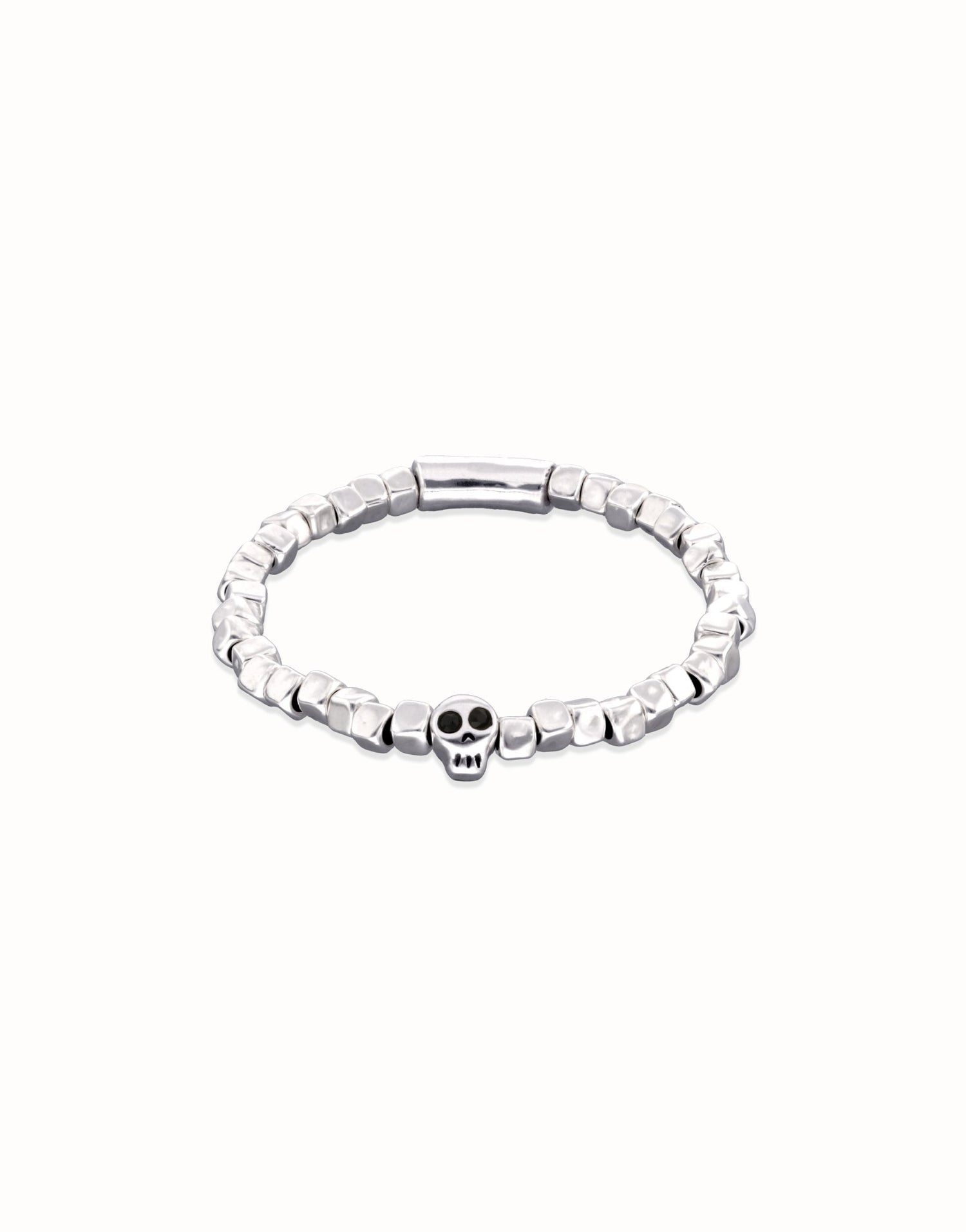 This Beaded Stretch Bracelet with a Skull by UNOde50 is a fearless statement of punk attitude from the Ser Imparable collection. Featuring sterling silver-plated beads encircling a central skull, the bracelet exudes audacity and rock-inspired charm. Handmade in Spain, its elastic design ensures comfort and effortless styling, perfect for layering or bold standalone wear. It channels a spirit of unstoppable energy and defiance, reflecting a lifestyle of courage, music, and adventure. Ideal for those who dare to stand out, it turns a bracelet into a powerful emblem of individuality and unapologetic style.