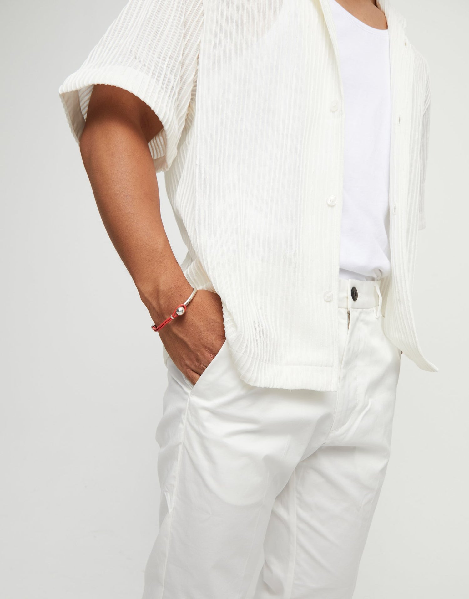 Handcrafted in sterling silver-plated metal with coral leather, semi-rigid design.
