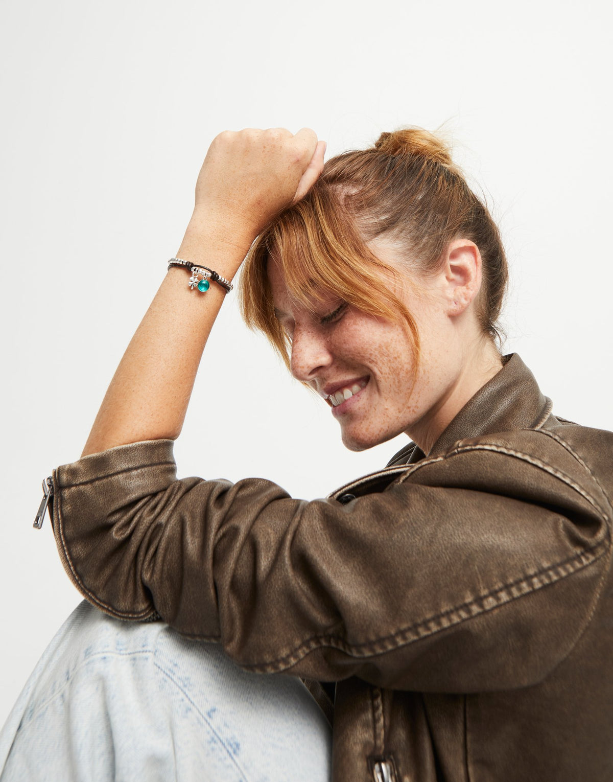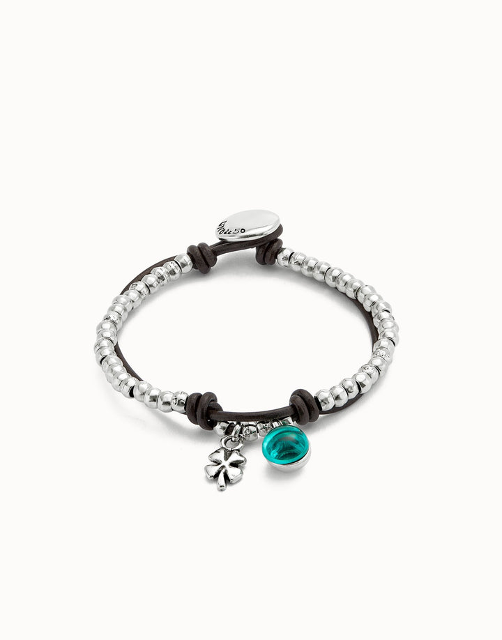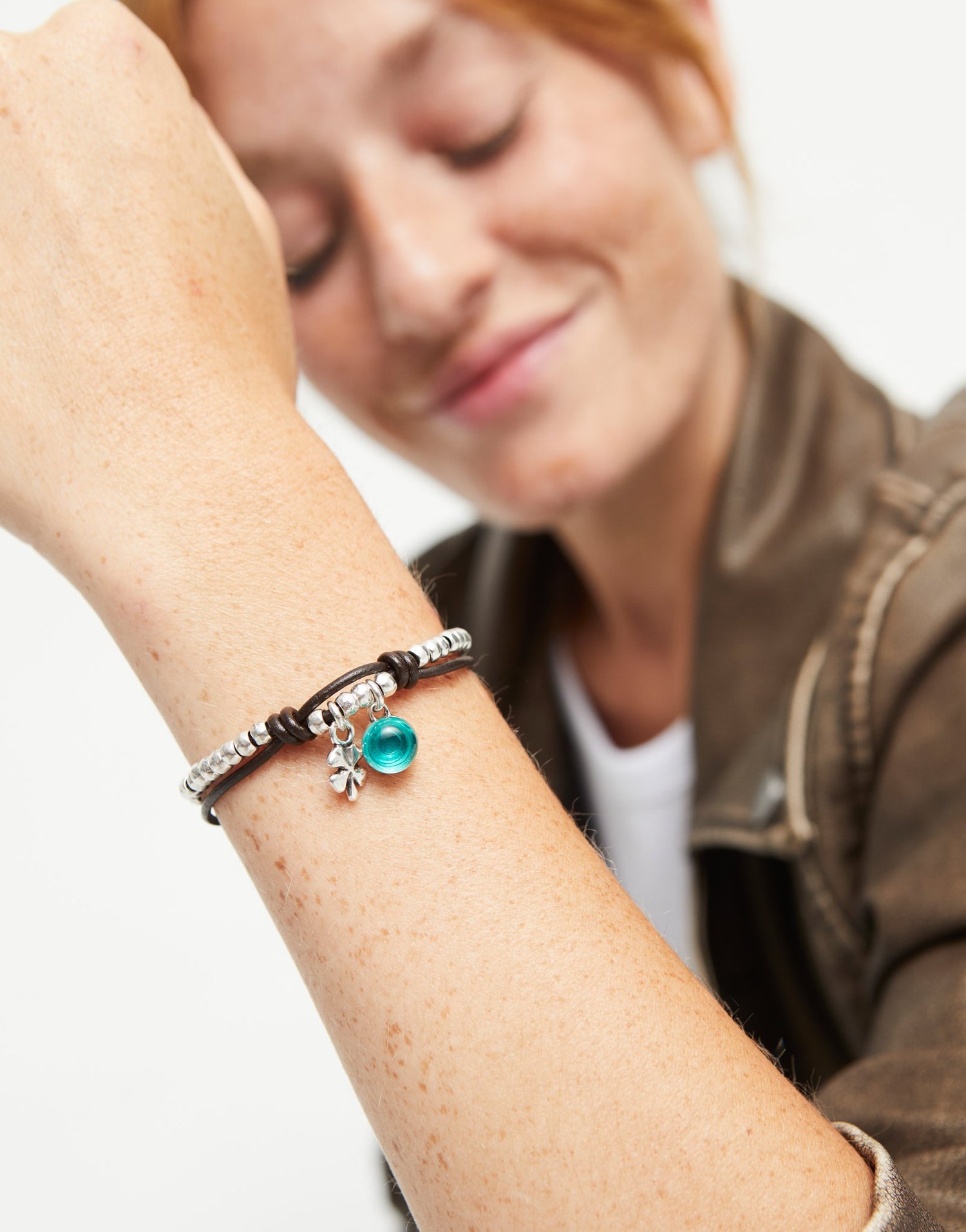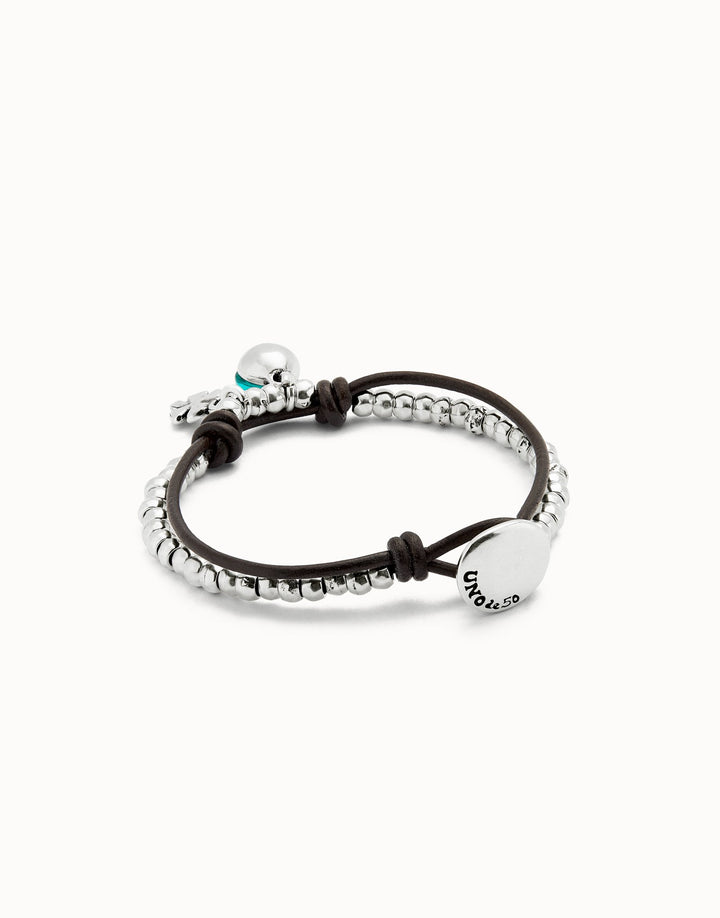 This Leather Beaded Bracelet with Green Murano Glass by UNOde50 captures magnetic allure and artisanal refinement from the Ser Fascinante collection. Sterling silver-plated beads with green Murano glass on supple leather create a tactile, visually striking piece. Handmade in Spain, it allows layered or standalone wear while emphasizing individuality, expressive charm, and contemporary style. The bracelet transforms a simple accessory into a statement of modern craftsmanship, personality, and bold elegance, perfect for those who embrace magnetic presence and unique handcrafted jewelry.