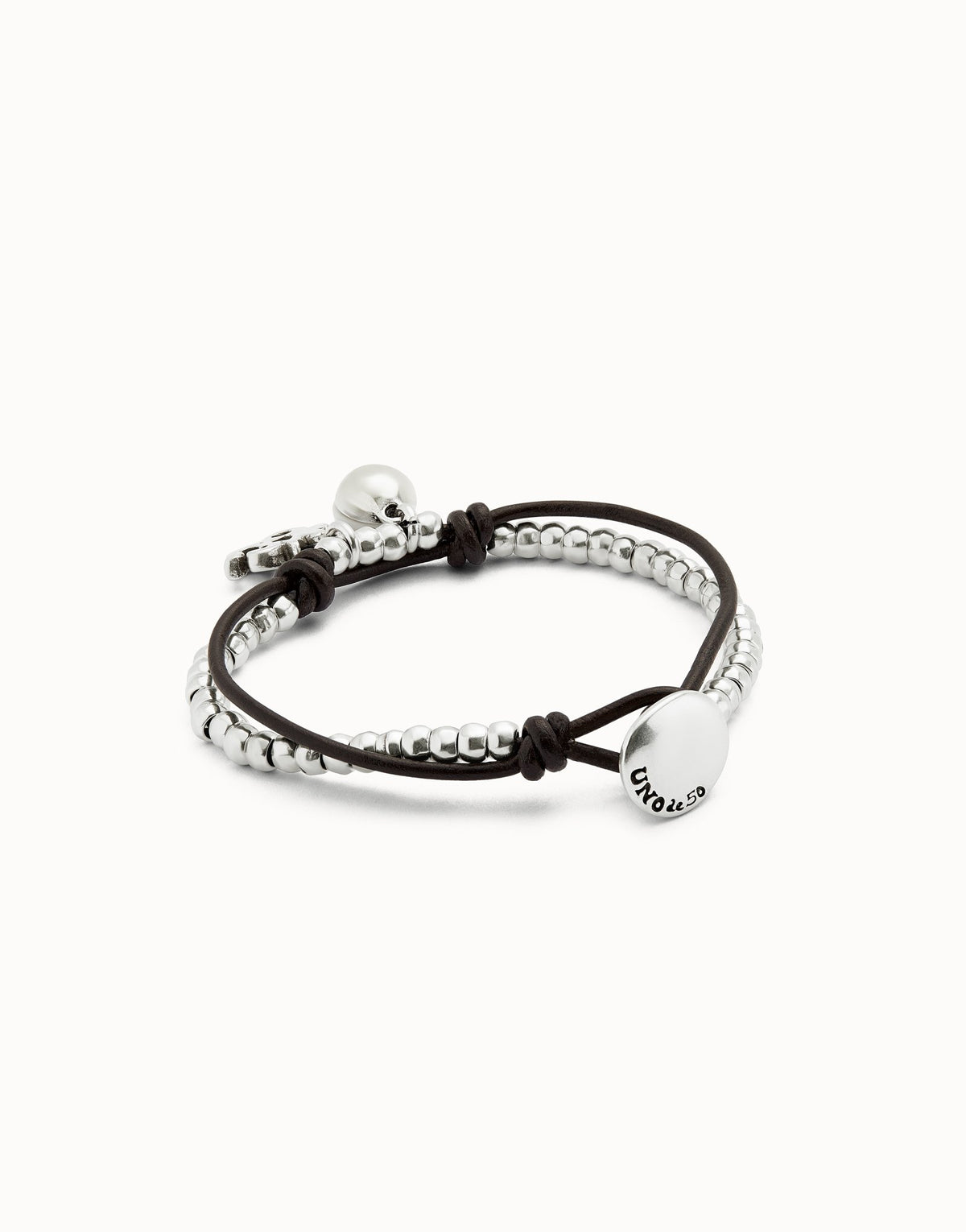 This Leather Beaded Bracelet with Ivory Murano Glass by UNOde50 is a refined, magnetic statement from the Ser Fascinante collection. Featuring sterling silver-plated beads with ivory Murano glass on supple leather, it exudes expressive charm and artisanal craftsmanship. Handmade in Spain, the bracelet is perfect for layered or solo styling, offering tactile elegance and contemporary sophistication. Its understated hue and meticulous design transform a simple accessory into a piece that embodies individuality, unique handcrafted artistry, and magnetic allure.