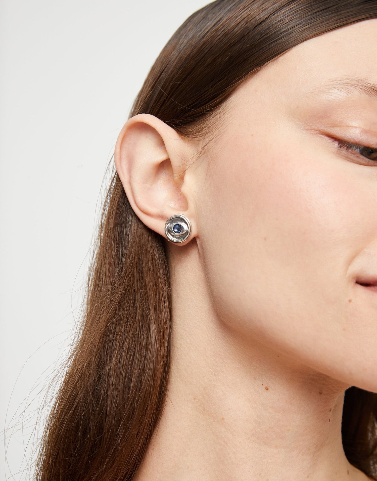 Handcrafted in sterling silver-plated metal with faceted blue crystal, maximum perimeter 1.5 cm, minimum length 1.5 cm, weight 4 g.