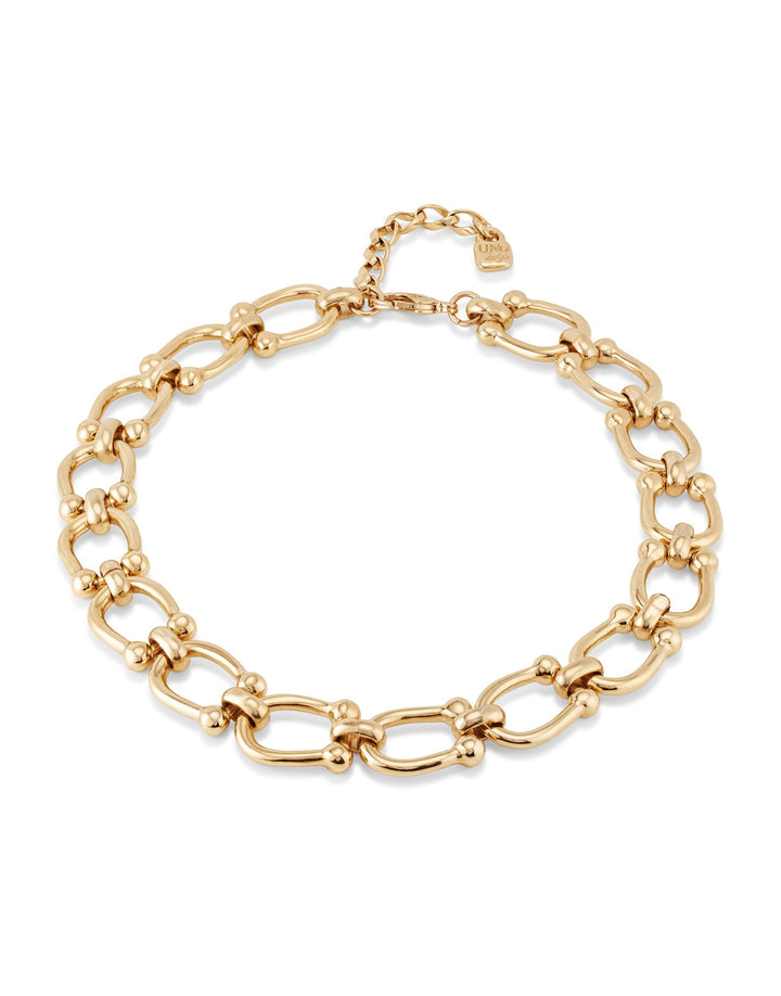 Handcrafted in 18k gold-plated metal alloy, short length, varying link sizes.