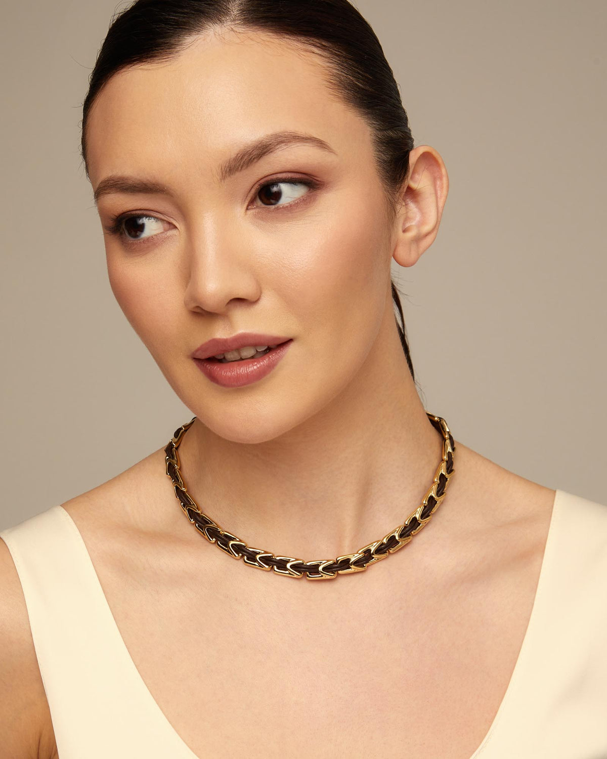 Handcrafted in 18k gold-plated metal alloy with leather, adjustable length 36–42 cm.